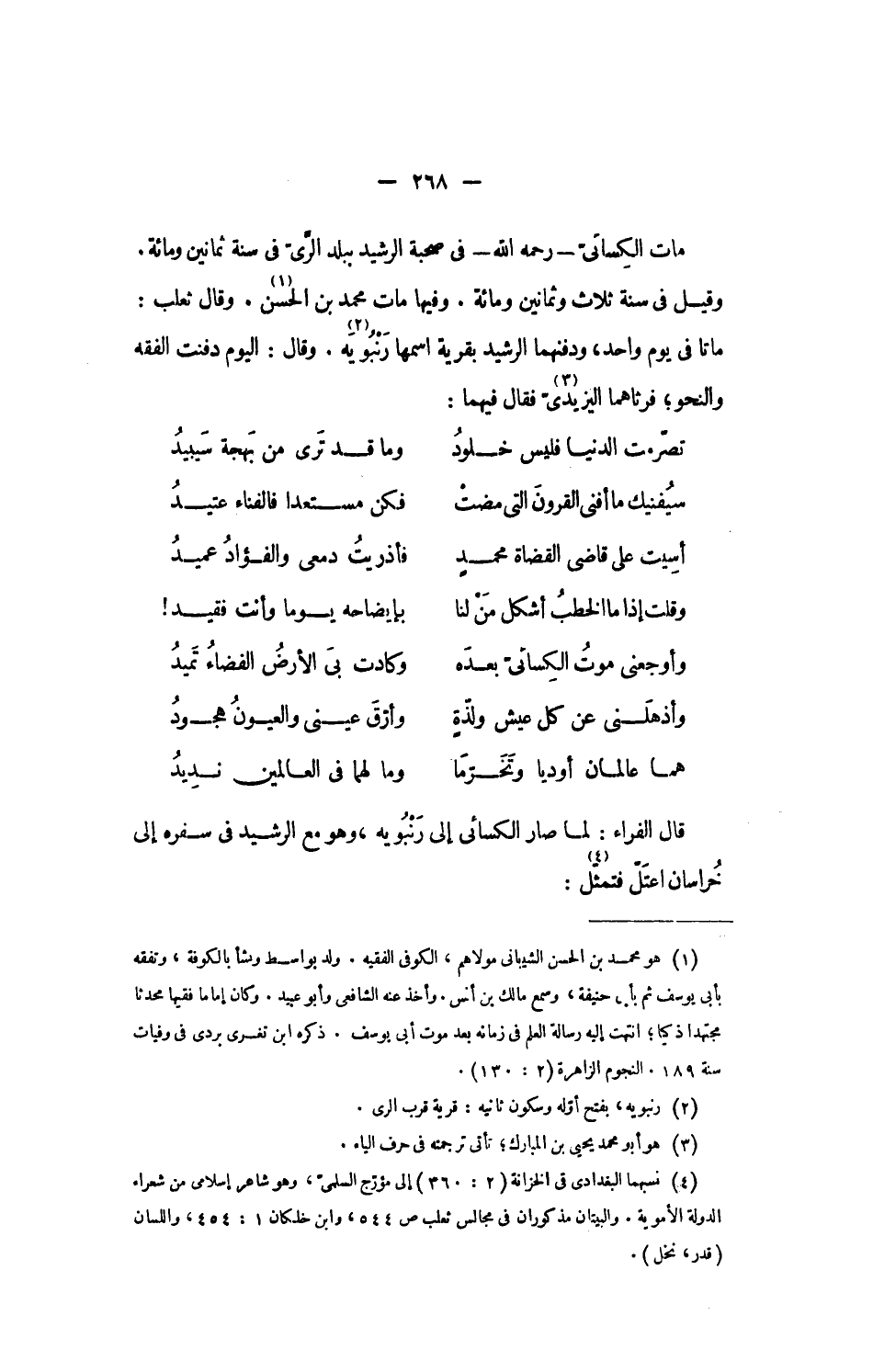 مات الكسائىّ- رحمه الله- فى صحبة الرشيد ببلد الرّىّ فى سنة ثمانين ومائة.