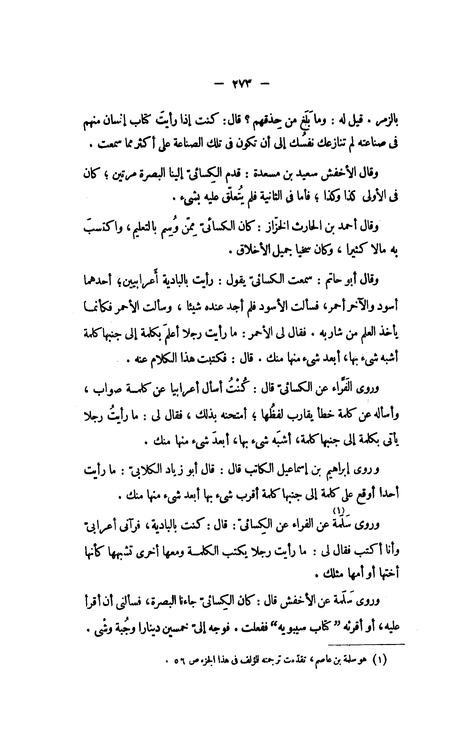 وقال الأخفش سعيد بن مسعدة: قدم الكسائىّ إلينا البصرة مرتين؛ كان فى الأولى كذا وكذا؛ فأما فى الثانية فلم يتعلّق عليه بشىء.