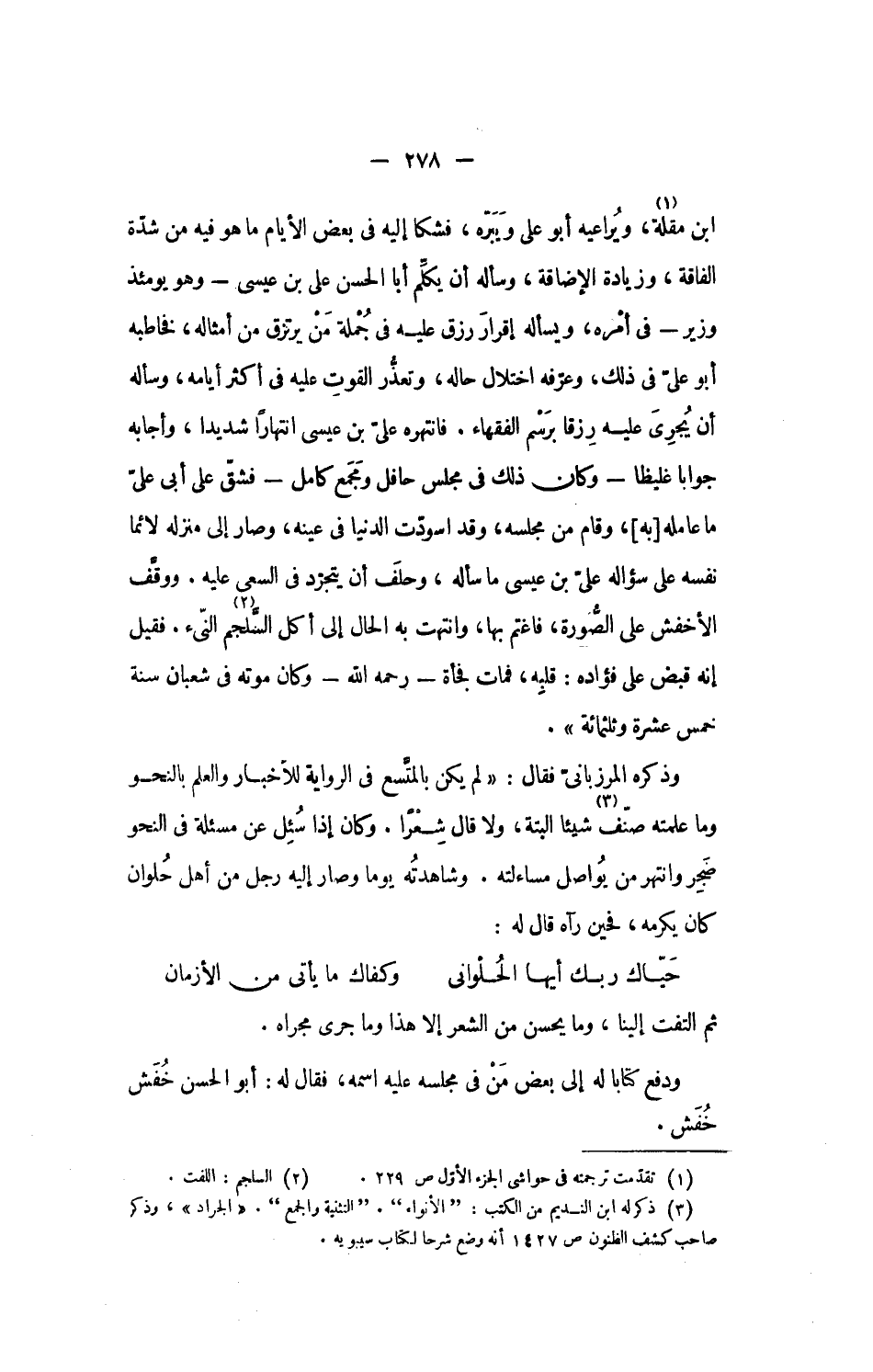 ابن مقلة «1»، ويراعيه أبو على ويبرّه، فشكا إليه فى بعض الأيام ما هو فيه من شدّة الفاقة، وزيادة الإضاقة، وسأله أن يكلّم أبا الحسن على بن عيسى- وهو يومئذ وزير- فى أمره، ويسأله إقرار رزق عليه فى جملة من يرتزق من أمثاله، فخاطبه أبو علىّ فى ذلك، وعرّفه اختلال حاله، وتعذّر القوت عليه فى أكثر أيامه، وسأله أن يجرى عليه رزقا برسم الفقهاء. فانتهره علىّ بن عيسى انتهارا شديدا، وأجابه جوابا غليظا- وكان ذلك فى مجلس حافل ومجمع كامل- فشقّ على أبى علىّ ما عامله [به]، وقام من مجلسه، وقد اسودّت الدنيا فى عينه، وصار إلى منزله لائما نفسه على سؤاله علىّ بن عيسى ما سأله، وحلف أن يتجرّد فى السعى عليه. ووقّف الأخفش على الصّورة، فاغتم بها، وانتهت به الحال إلى أكل السّلجم «2» النّىء. فقيل إنه قبض على فؤاده: قلبه، فمات فجأة- رحمه الله- وكان موته فى شعبان سنة خمس عشرة وثلاثمائة».