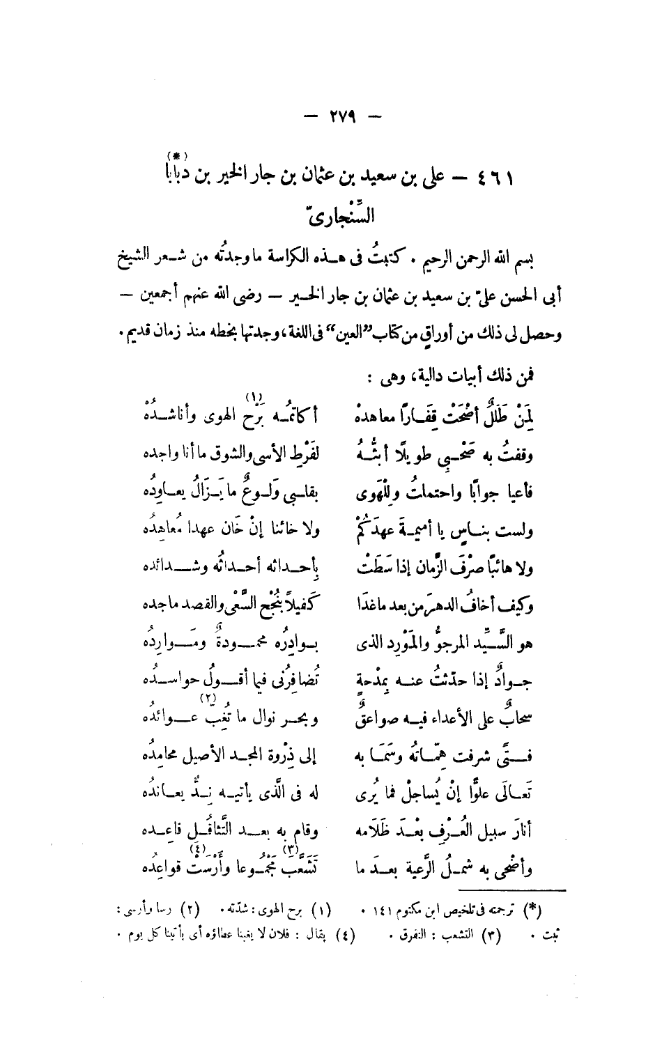 بسم الله الرحمن الرحيم. كتبت فى هذه الكراسة ما وجدته من شعر الشيخ أبى الحسن علىّ بن سعيد بن عثمان بن جار الخير- رضى الله عنهم أجمعين- وحصل لى ذلك من أوراق من كتاب العين فى اللغة، وجدتها بخطه منذ زمان قديم.