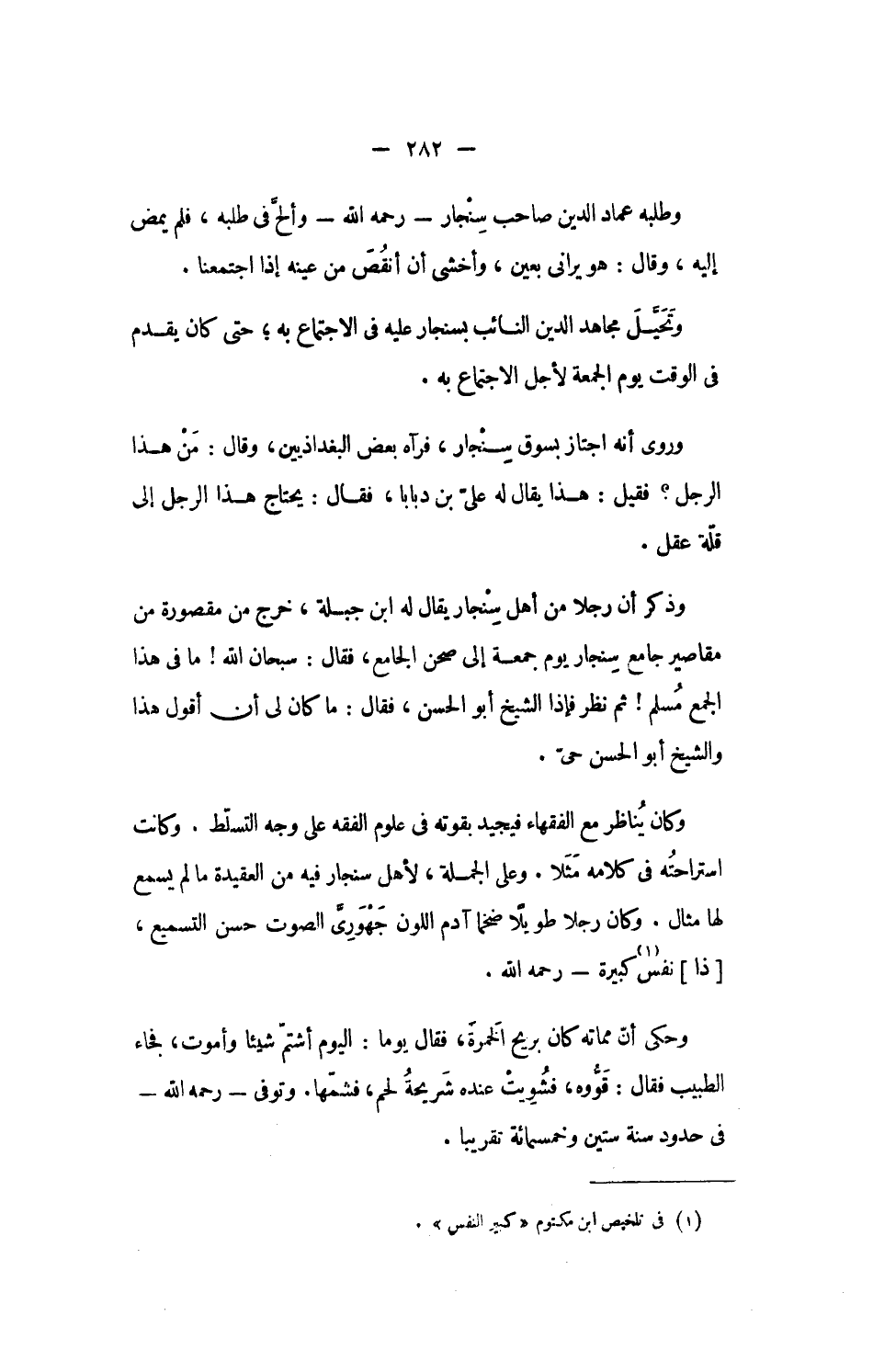وذكر أن رجلا من أهل سنجار يقال له ابن جبلة، خرج من مقصورة من مقاصير جامع سنجار يوم جمعة إلى صحن الجامع، فقال: سبحان الله! ما فى هذا الجمع مسلم! ثم نظر فإذا الشيخ أبو الحسن، فقال: ما كان لى أن أقول هذا والشيخ أبو الحسن حىّ.