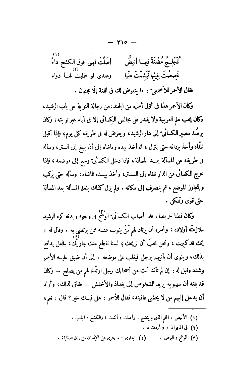 فقال الأحمر للأصمعىّ: ما يتعرض لك فى اللغة إلّا مجنون.