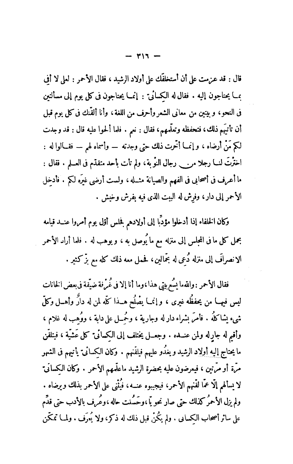 قال: قد عزمت على أن أستخلفك على أولاد الرشيد، فقال الأحمر: لعلى لا أفى بما يحتاجون إليه. فقال له الكسائىّ: إنما يحتاجون فى كل يوم إلى مسألتين فى النحو، وبيتين من معانى الشعر وأحرف من اللغة، وأنا ألقّنك فى كل يوم قبل أن تأتيهم ذلك، فتحفظه وتعلّمهم، فقال: نعم. فلما ألحوا عليه قال: قد وجدت لكم من أرضاه، وإنما أخّرت ذلك حتى وجدته- وأسماه لهم- فقالوا له: