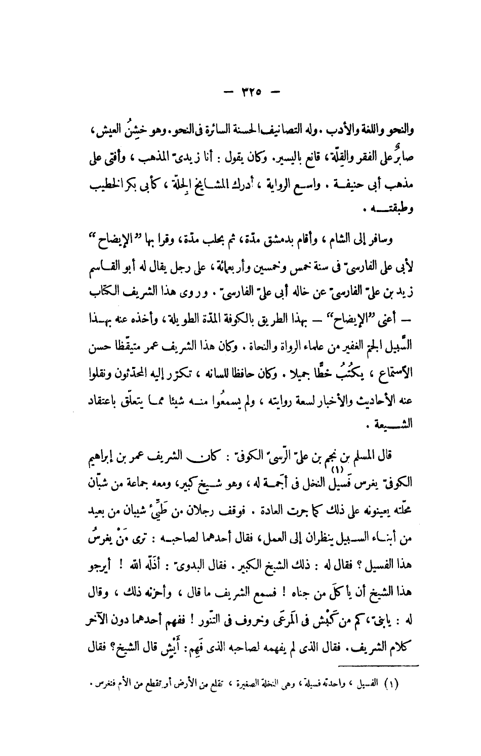 وسافر إلى الشام، وأقام بدمشق مدّة، ثم بحلب مدّة، وقرا بها الإيضاح لأبى على الفارسىّ فى سنة خمس وخمسين وأربعمائة، على رجل يقال له أبو القاسم زيد بن علىّ الفارسىّ عن خاله أبى علىّ الفارسىّ. وروى هذا الشريف الكتاب- أعنى الإيضاح- بهذا الطريق بالكوفة المدّة الطويلة، وأخذه عنه بهذا السّبيل الجمّ الغفير من علماء الرواة والنحاة. وكان هذا الشريف عمر متيقّظا حسن الاستماع، يكتب خطّا جميلا. وكان حافظا للسانه، تكرّر إليه المحدّثون ونقلوا عنه الأحاديث والأخبار لسعة روايته، ولم يسمعوا منه شيئا مما يتعلّق باعتقاد الشيعة.