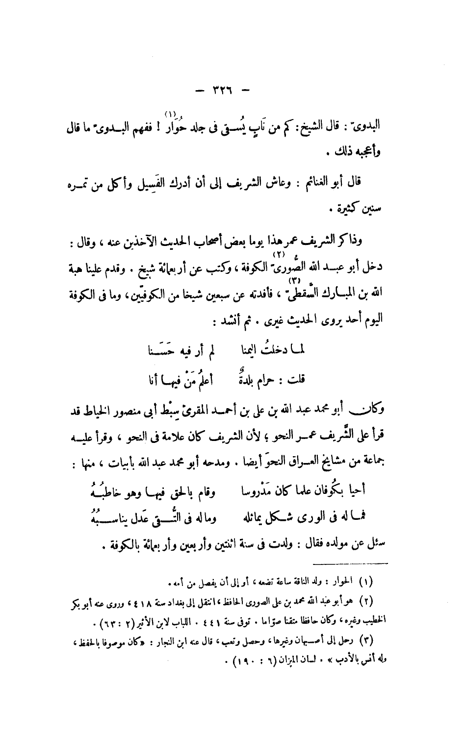 دخل أبو عبد الله الصّورىّ «2» الكوفة، وكتب عن أربعمائة شيخ. وقدم علينا هبة الله بن المبارك السّقطىّ «3»، فأفدته عن سبعين شيخا من الكوفيّين، وما فى الكوفة اليوم أحد يروى الحديث غيرى. ثم أنشد: