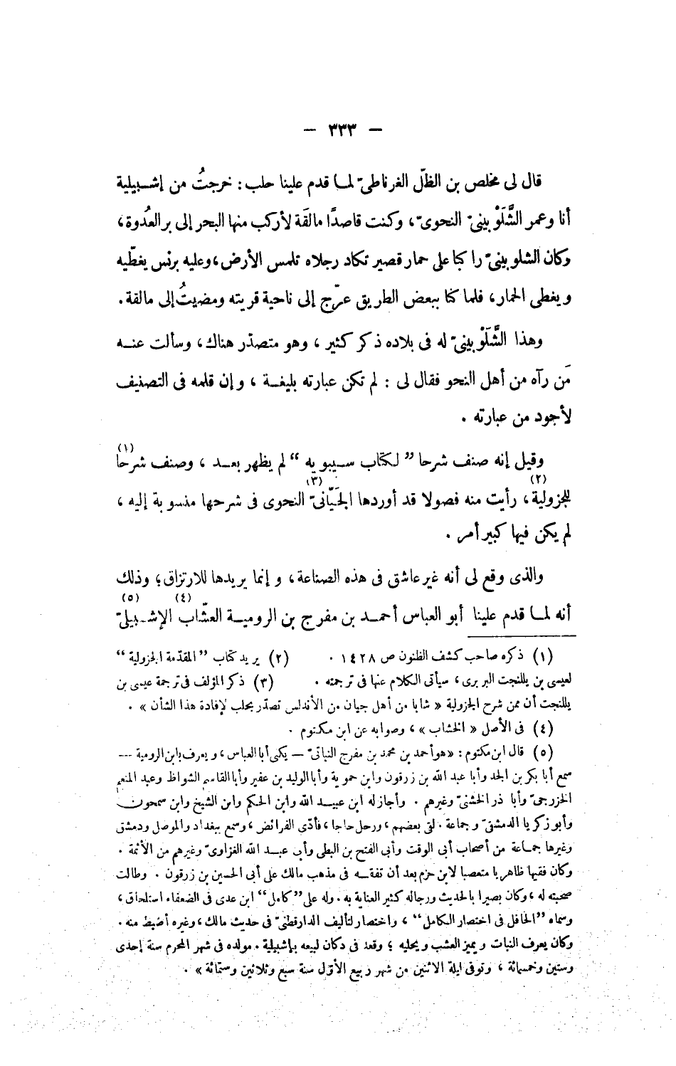 قال لى مخلص بن الظّل الغرناطىّ لما قدم علينا حلب: خرجت من إشبيلية أنا وعمر الشّلوبينىّ النحوىّ، وكنت قاصدا مالقة لأركب منها البحر إلى بر العدوة، وكان الشلوبينىّ راكبا على حمار قصير تكاد رجلاه تلمس الأرض، وعليه برنس يغطّيه ويغطى الحمار، فلما كنا ببعض الطريق عرّج إلى ناحية قريته ومضيت إلى مالقة.