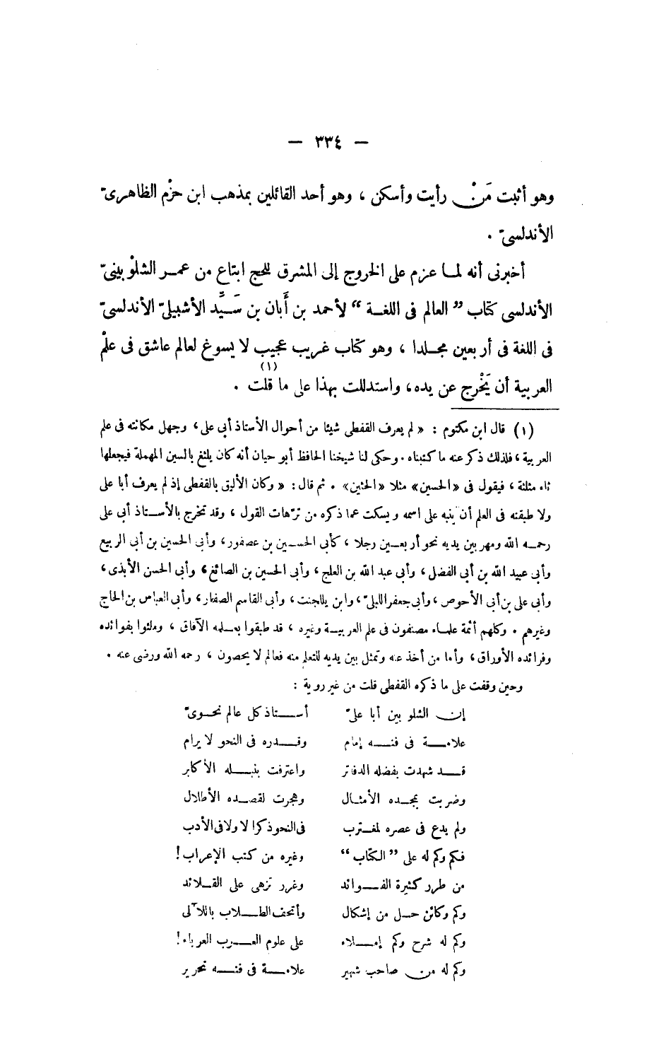 أخبرنى أنه لما عزم على الخروج إلى المشرق للحج ابتاع من عمر الشلوبينىّ الأندلسى كتاب العالم فى اللغة لأحمد بن أبان بن سيّد الأشبيلىّ الأندلسىّ فى اللغة فى أربعين مجلدا، وهو كتاب غريب عجيب لا يسوغ لعالم عاشق فى علم العربية أن يخرج عن يده، واستدللت بهذا على ما قلت «1».
