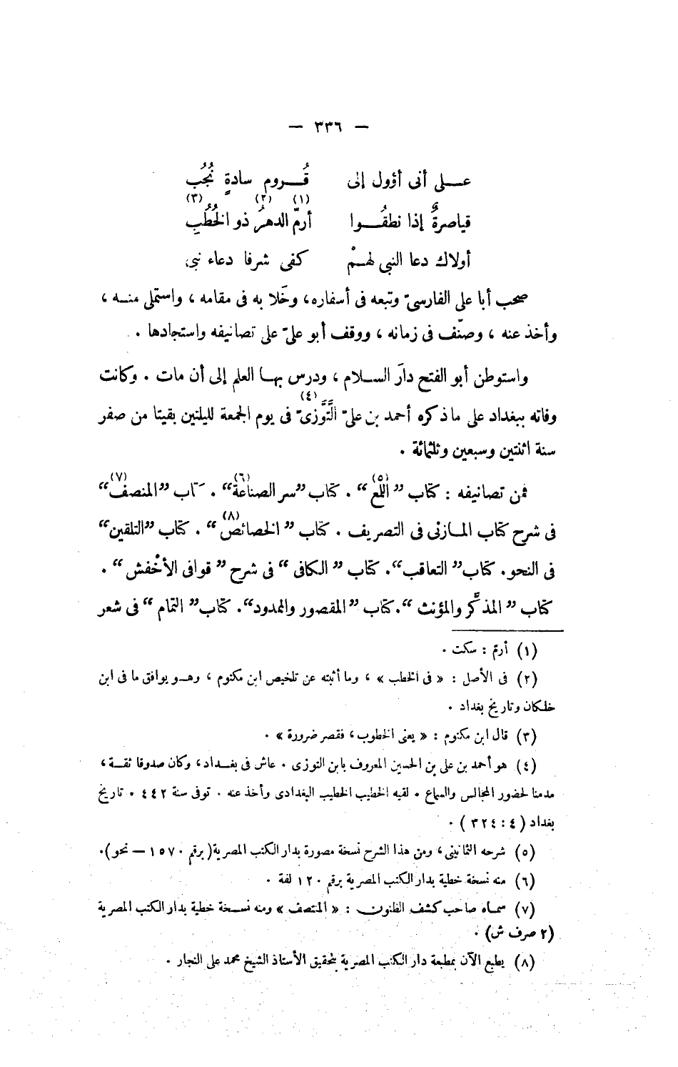 فمن تصانيفه: كتاب اللمع «5». كتاب سر الصناعة «6». كتاب المنصف «7» فى شرح كتاب المازنى فى التصريف. كتاب الخصائص «8». كتاب التلقين فى النحو. كتاب التعاقب. كتاب الكافى فى شرح قوافى الأخفش.