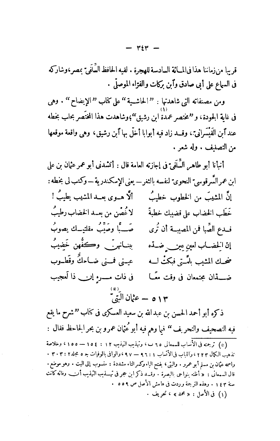 ذكره أبو أحمد الحسن بن عبد الله بن سعيد العسكرى فى كتاب شرح ما يقع فيه التصحيف والتحريف فيما وهم فيه أبو عثمان عمرو بن بحر الجاحظ فقال: