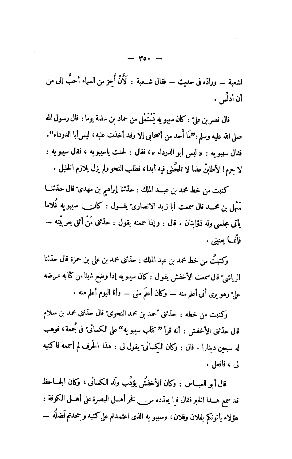 قال نصر بن علىّ: كان سيبويه يستملى من حماد بن سلمة يوما: قال رسول الله صلى الله عليه وسلم: ما أحد من أصحابى إلا وقد أخذت عليه، ليس أبا الدرداء.