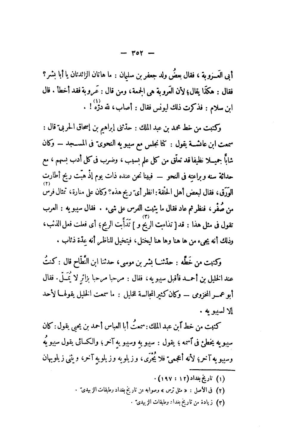 كتبت من خط ابن عبد الملك: سمعت أبا العباس أحمد بن يحيى يقول: كان سيبويه يخطئ فى اسمه؛ يقول: سيبويه وسيبويه آخر؛ والكسائى يقول سيبويه وسيبويه آخر؛ لأنه أعجمىّ فلا يجرى، وزيلويه وزيلويه آخر، ويثنى زيلويهان