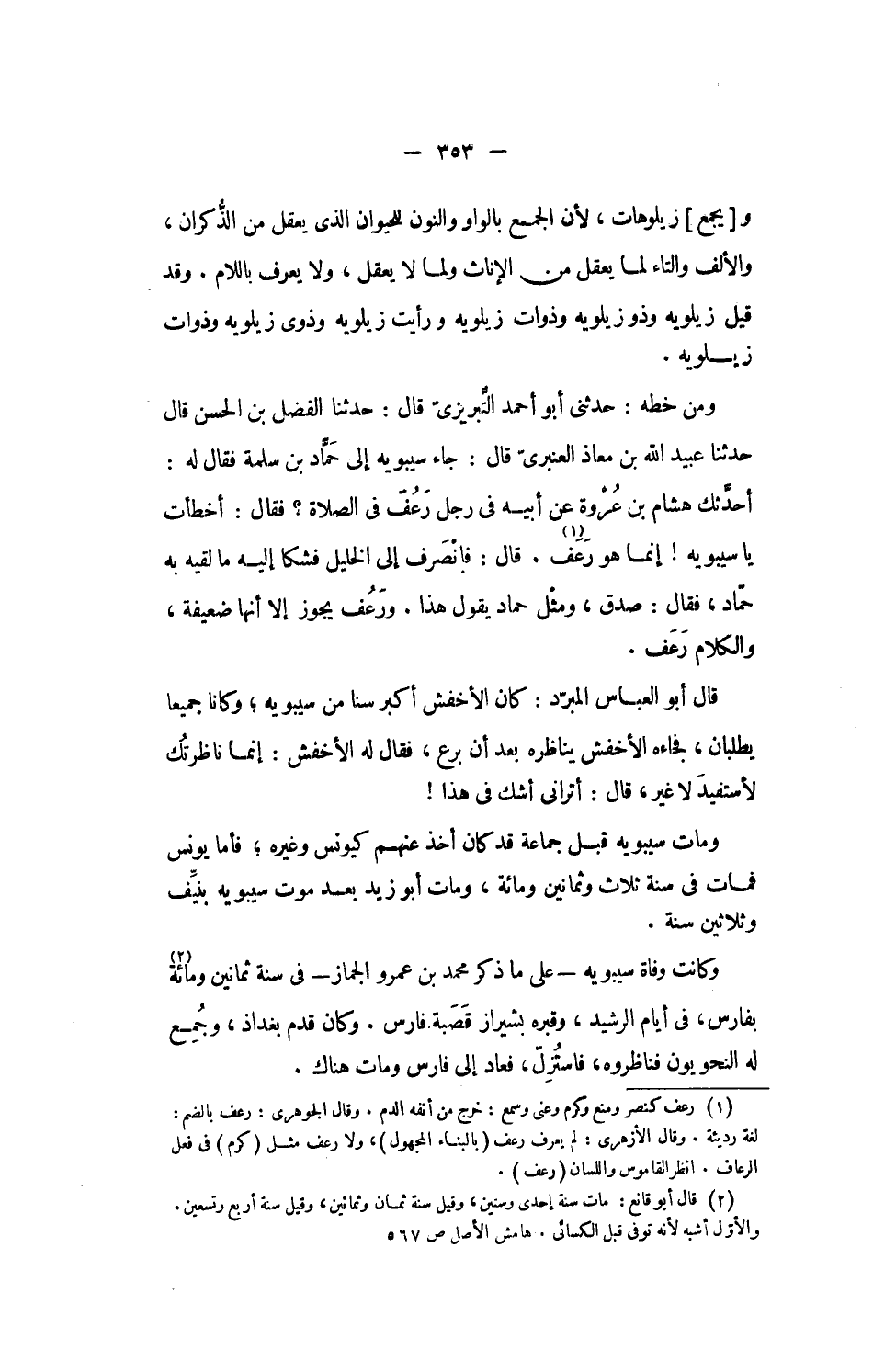 أحدّثك هشام بن عروة عن أبيه فى رجل رعف فى الصلاة؟ فقال: أخطأت يا سيبويه! إنما هو رعف. «1» قال: فانصرف إلى الخليل فشكا إليه ما لقيه به حمّاد، فقال: صدق، ومثل حماد يقول هذا. ورعف يجوز إلا أنها ضعيفة، والكلام رعف.