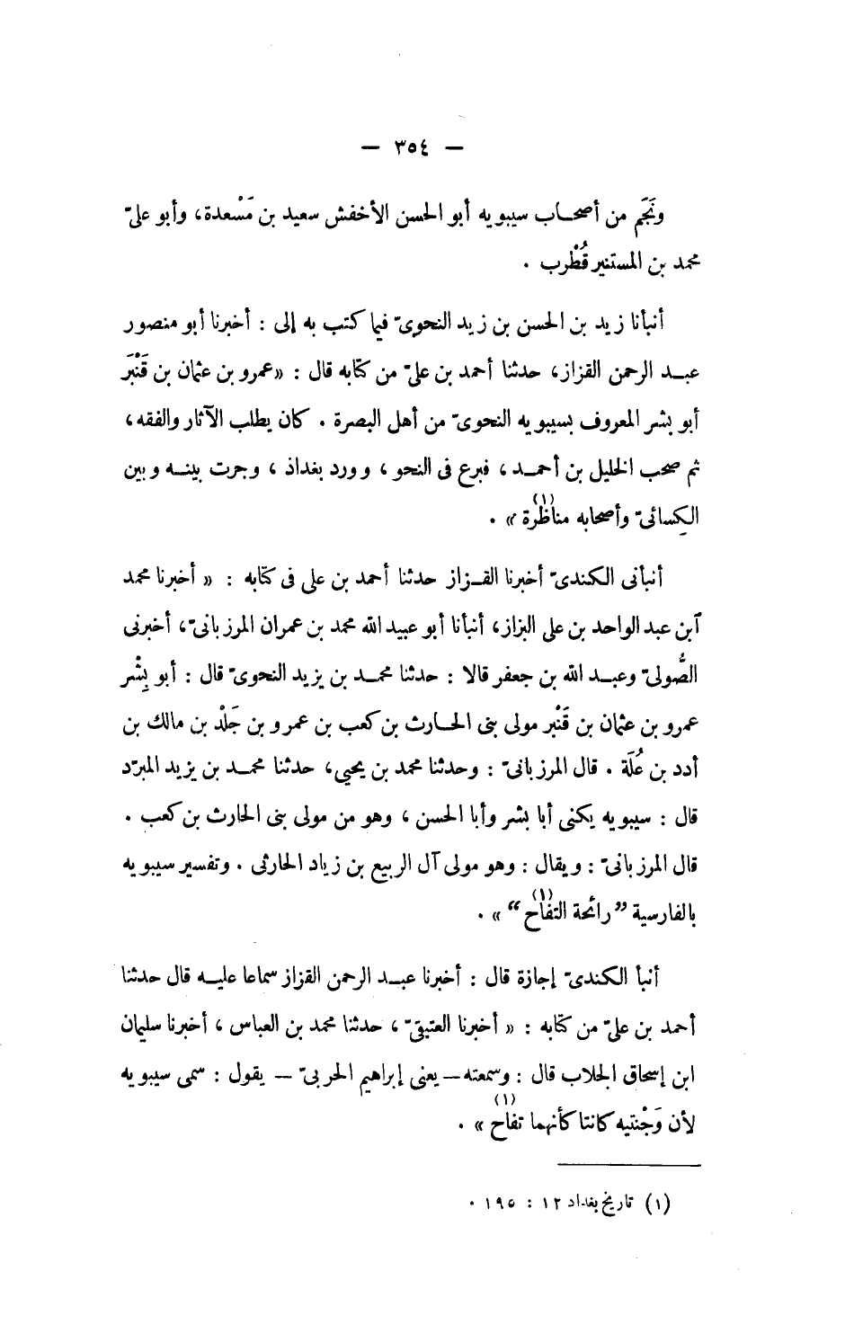 أنبأنا زيد بن الحسن بن زيد النحوىّ فيما كتب به إلى: أخبرنا أبو منصور عبد الرحمن القزاز، حدثنا أحمد بن علىّ من كتابه قال: «عمرو بن عثمان بن قنبر أبو بشر المعروف بسيبويه النحوىّ من أهل البصرة. كان يطلب الآثار والفقه، ثم صحب الخليل بن أحمد، فبرع فى النحو، وورد بغداذ، وجرت بينه وبين الكسائىّ وأصحابه مناظرة». «1»