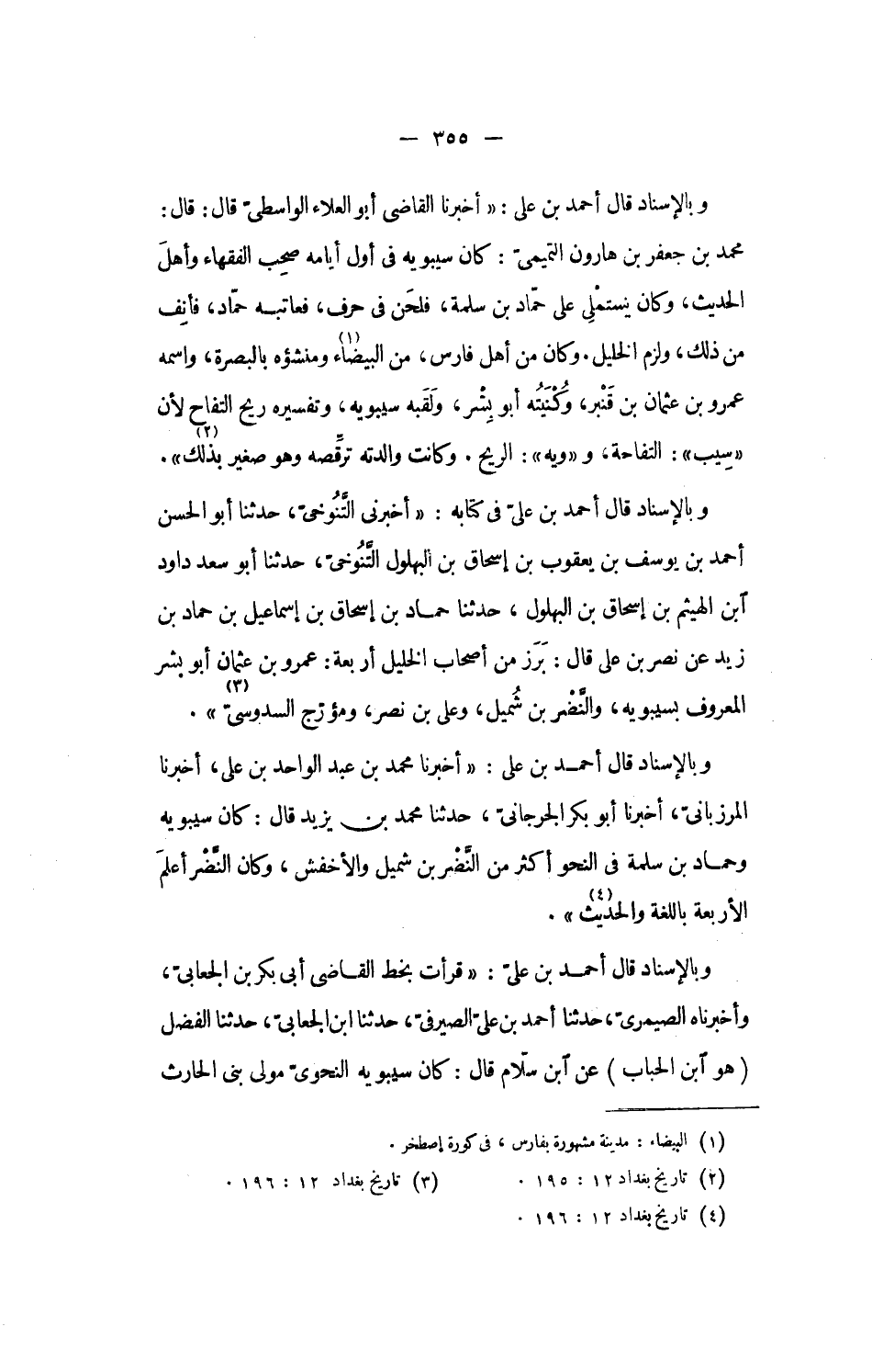وبالإسناد قال أحمد بن علىّ: «قرأت بخط القاضى أبى بكر بن الجعابىّ، وأخبرناه الصيمرىّ، حدثنا أحمد بن علىّ الصيرفىّ، حدثنا ابن الجعابىّ، حدثنا الفضل (هو ابن الحباب) عن ابن سلّام قال: كان سيبويه النحوىّ مولى بنى الحارث