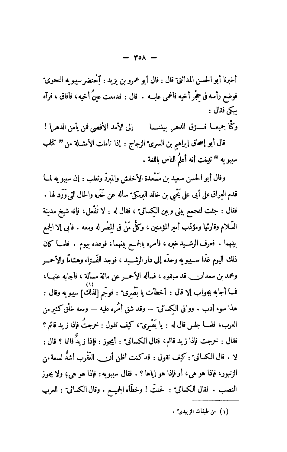 أخبرنا أبو الحسن المدائنىّ قال: قال أبو عمرو بن يزيد: احتضر سيبويه النحوىّ فوضع رأسه فى حجر أخيه فأغمى عليه. قال: فدمعت عين أخيه، فأفاق، فرآه يبكى فقال: