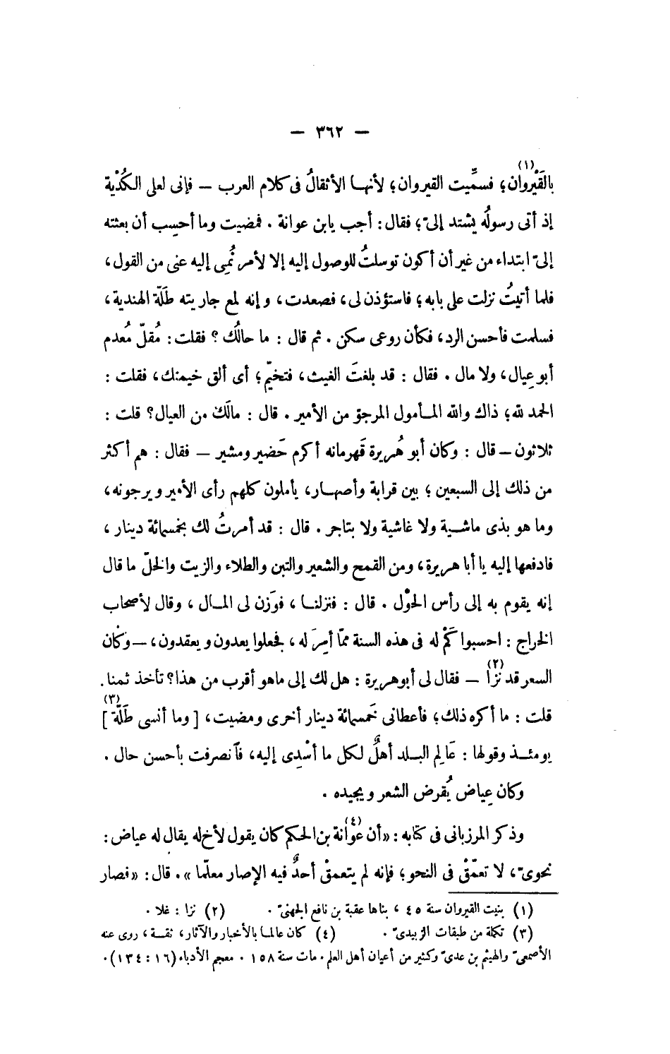 ثلاثون- قال: وكان أبو هريرة قهرمانه أكرم حضير ومشير- فقال: هم أكثر من ذلك إلى السبعين؛ بين قرابة وأصهار، يأملون كلهم رأى الأمير ويرجونه، وما هو بذى ماشية ولا غاشية ولا بتاجر. قال: قد أمرت لك بخمسمائة دينار، فادفعها إليه يا أبا هريرة، ومن القمح والشعير والتبن والطلاء والزيت والخلّ ما قال إنه يقوم به إلى رأس الحول. قال: فنزلنا، فوزن لى المال، وقال لأصحاب الخراج: احسبوا كم له فى هذه السنة ممّا أمر له، فجعلوا يعدون ويعقدون،- وكان السعر قد نزا «2» - فقال لى أبو هريرة: هل لك إلى ما هو أقرب من هذا؟ تأخذ ثمنا.