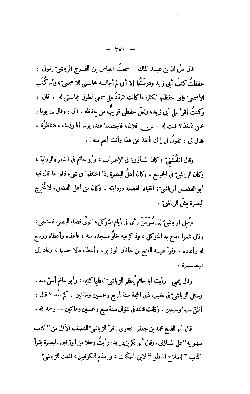 وقال الخشنىّ: كان المازنىّ فى الإعراب، وأبو حاتم فى الشعر والرواية، وكان الرياشىّ فى الجميع. وكان أهل البصرة إذا اختلفوا فى شىء قالوا ما قال فيه أبو الفضل الرياشىّ، انقيادا لفضله وروايته. وكان من أهل الفضل، لا تخرج البصرة مثل الرياشىّ.