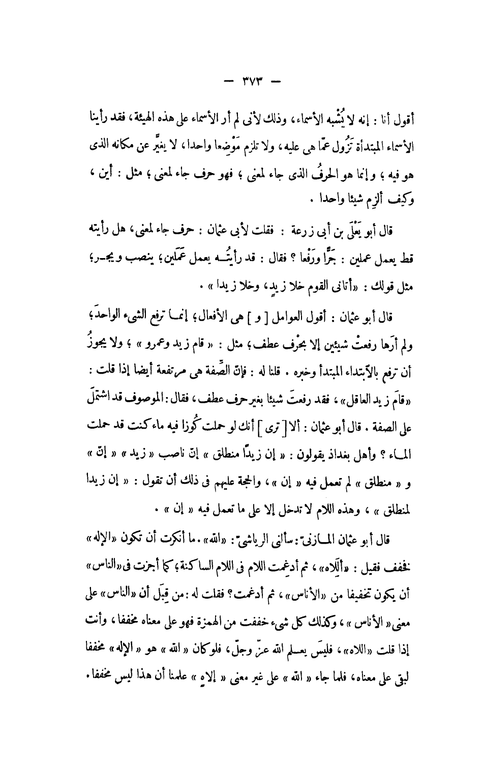 «قام زيد العاقل»، فقد رفعت شيئا بغير حرف عطف، فقال: الموصوف قد اشتمل على الصفة. قال أبو عثمان: ألا [ترى] أنك لو حملت كوزا فيه ماء كنت قد حملت الماء؟ وأهل بغداذ يقولون: «إن زيدا منطلق» إنّ ناصب «زيد» «إنّ» و «منطلق» لم تعمل فيه «إن»، والحجة عليهم فى ذلك أن تقول: «إن زيدا لمنطلق»، وهذه اللام لا تدخل إلا على ما تعمل فيه «إن».