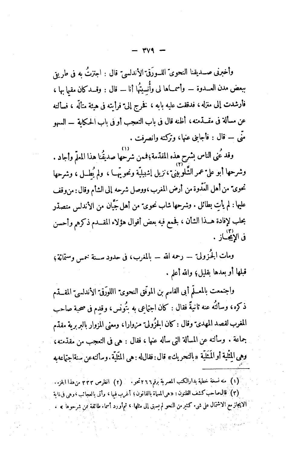 واجتمعت بالمعلّم أبى القاسم بن الموفّق النحوىّ اللورقىّ الأندلسىّ المقدّم ذكره، وسألته عنه ثانية فقال: كان اجتماعى به بتونس، وقدم فى صحبة صاحب المغرب لقصد المهدىّ وقال: كان الجزولىّ مزوارا، ومعنى المزوار بالبربرية مقدّم جماعة. وسألته عن المسألة التى سأله عنها، فقال: هى فى التعجب من مقدّمته، وهى المثلية أو المثليّة «بالتحريك» قال: فقال له: هى المثليّة. وسألته عن سنة اجتماعه به
