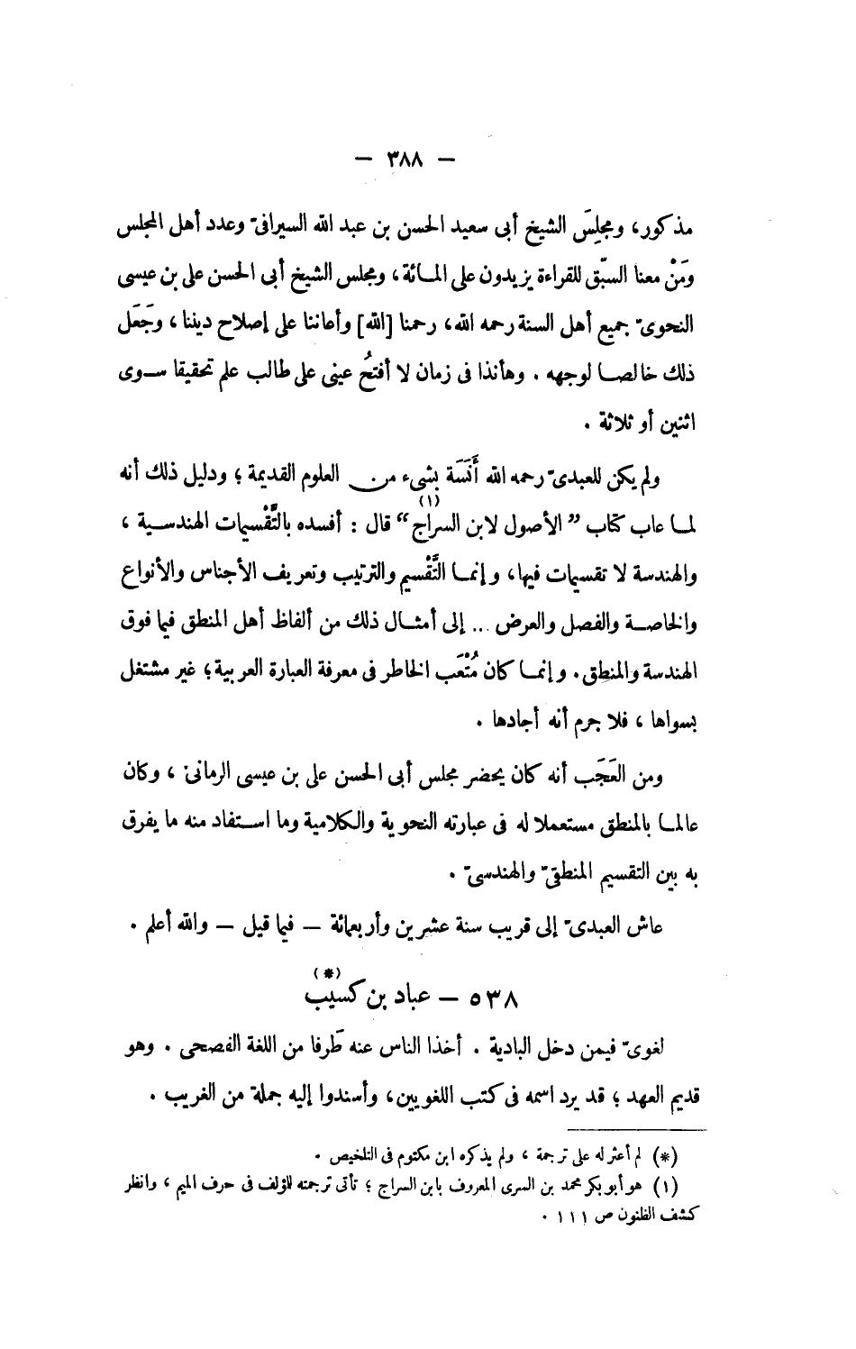 مذكور، ومجلس الشيخ أبى سعيد الحسن بن عبد الله السيرافىّ وعدد أهل المجلس ومن معنا السبّق للقراءة يزيدون على المائة، ومجلس الشيخ أبى الحسن على بن عيسى النحوىّ جميع أهل السنة رحمه الله، رحمنا [الله] وأعاننا على إصلاح ديننا، وجعل ذلك خالصا لوجهه. وهأنذا فى زمان لا أفتح عينى على طالب علم تحقيقا سوى اثنين أو ثلاثة.
