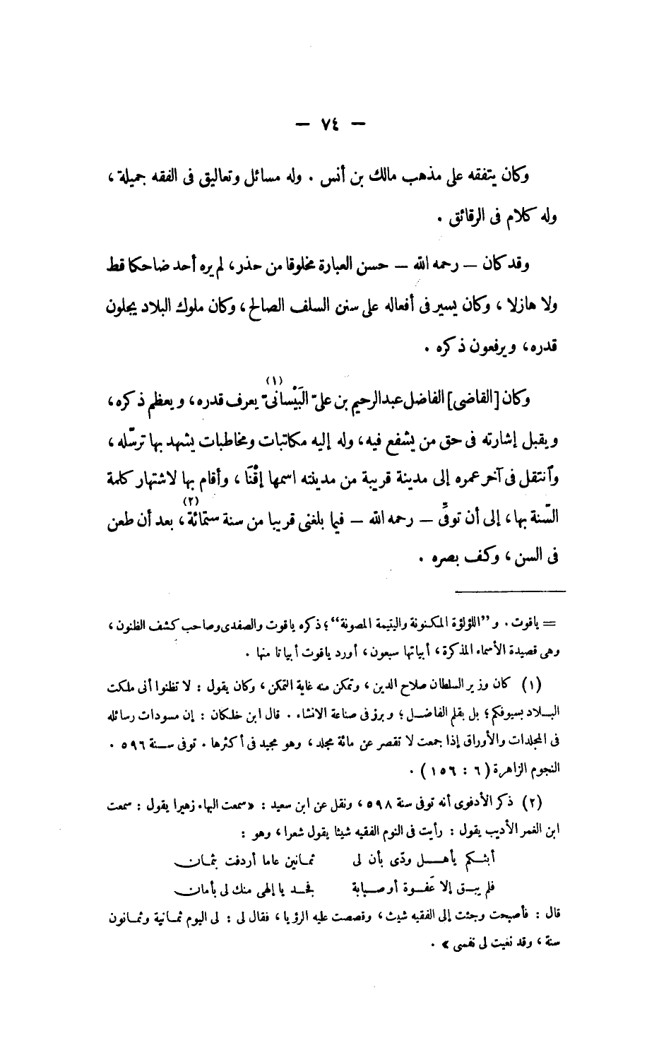وكان [القاضى] الفاضل عبد الرحيم بن علىّ البيسانىّ «1» يعرف قدره، ويعظم ذكره، ويقبل إشارته فى حق من يشفع فيه، وله إليه مكاتبات ومخاطبات يشهد بها ترسّله، وانتقل فى آخر عمره إلى مدينة قريبة من مدينته اسمها إقنا، وأقام بها لاشتهار كلمة السّنة بها، إلى أن توفىّ- رحمه الله- فيما بلغنى قريبا من سنة ستمائة «2»، بعد أن طعن فى السن، وكف بصره.