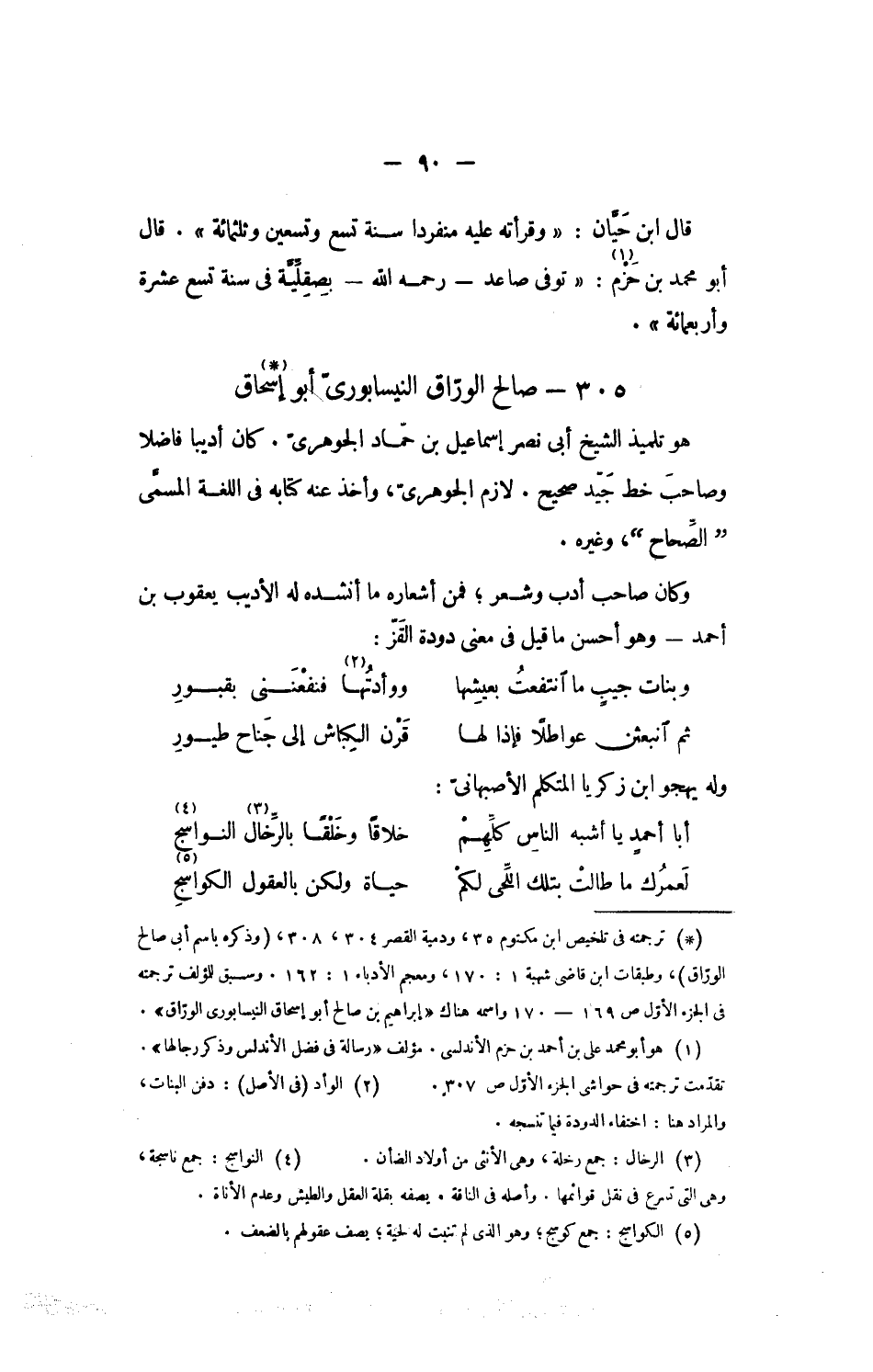 [1] ترجمته فى تلخيص ابن مكتوم 35، ودمية القصر 304، 308، (وذكره باسم أبى صالح الورّاق)، وطبقات ابن قاضى شهبة 1: 170، ومعجم الأدباء 1: 162. وسبق للمؤلف ترجمته فى الجزء الأوّل ص 169 - 170 واسمه هناك «إبراهيم بن صالح أبو إسحاق النيسابورى الورّاق».