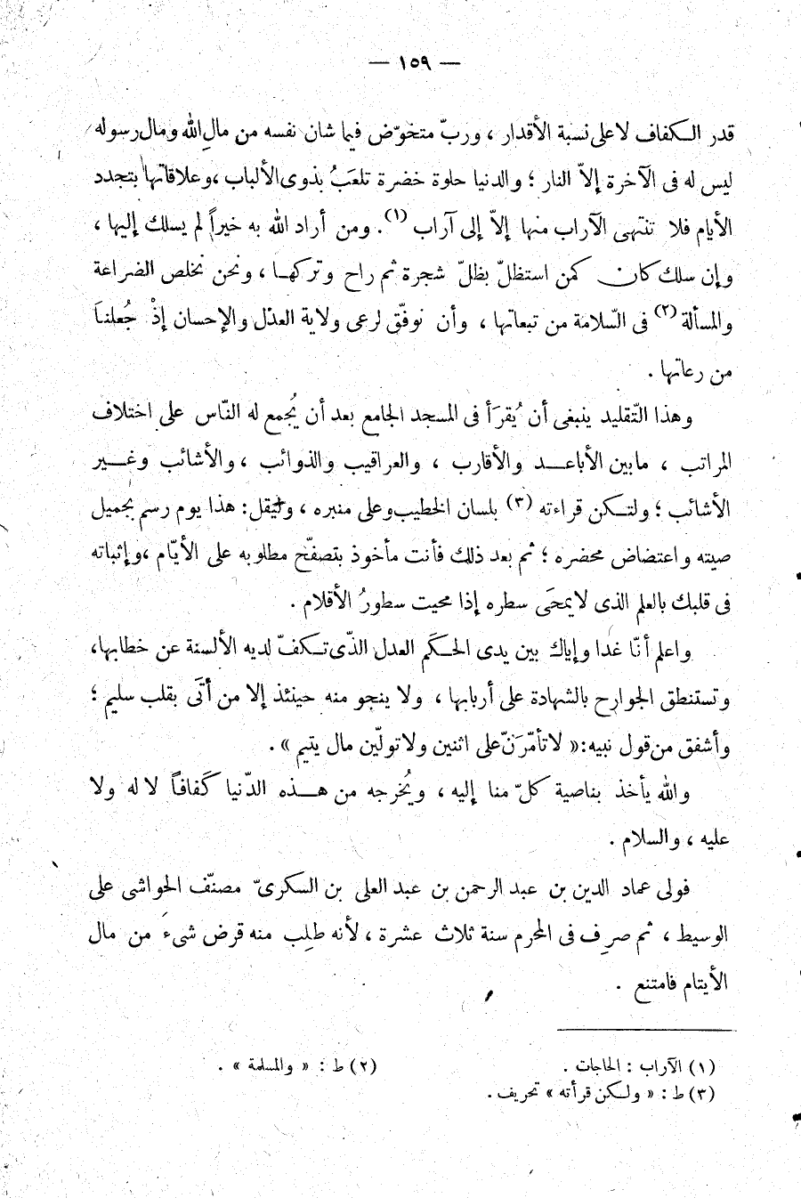 قدر الكفاف لا على نسبة الأقدار، ورب متخوض فيما شان نفسه من مال الله، ومال رسوله ليس له في الآخرة إلا النار؛ والدنيا حلوة خضرة تلعب بذوي الألباب، وعلاقاتها بتجدد الأيام فلا تنتهي الآراب منها إلا إلى آراب (¬1) . ومن أراد الله به خيرًا لم يسلك إليها، وإن سلك كان كمن استظل بظل شجرة ثم راح وتركها، ونحن نخلص الضراعة والمسألة (¬2) في السلامة من تبعاتها، وأن نوفق لرعي ولاية العدل والإحسان إذ جعلنا من رعاتها.