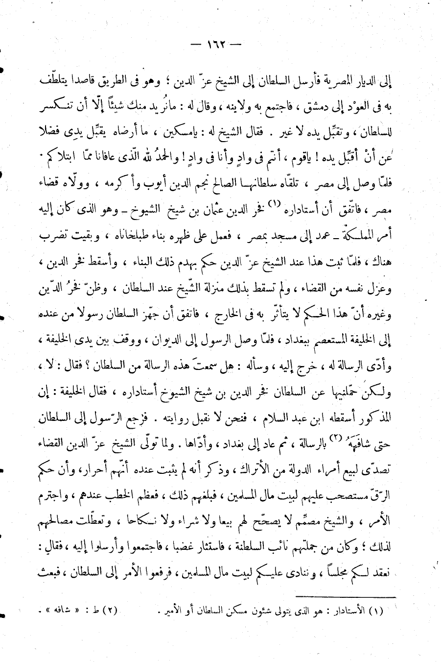 الشيخ عز الدين؛ وهو في الطريق قاصدا يتلطف به في العود إلى دمشق، فاجتمع به ولاينه، وقال له: ما نريد منك شيئًا إلا أن تنكسر للسلطان، وتقبل يده لا غير. فقال الشيخ له: يا مسكين، ما أرضاه يقبل يدي فضلا عن أن أقبل يده! يا قوم، أنتم في واد وأنا في واد! والحمد لله الذي عافانا مما ابتلاكم. فلما وصل إلى مصر، تلقاه سلطانها الصالح نجم الدين أيوب وأكرمه، وولاه قضاء مصر، فاتفق أن أستاداره (¬1) فخر الدين عثمان بن شيخ الشيوخ -وهو الذي كان إليه أمر المملكة- عمد إلى مسجد بمصر، فعمل على ظهره بناء طبلخاناه، وبقيت تضرب هناك، فلما ثبت هذا عند الشيخ عز الدين حكم بهدم ذلك البناء، وأسقط فخر الدين، وعزل نفسه من القضاء، ولم تسقط بذلك منزلة الشيخ عند السلطان، وظن فخر الدين وغيره أن هذا الحكم لا يتأثر به في الخارج، فاتفق أن جهز السلطان رسولا من عنده إلى الخليفة المستعصم ببغداد، فلما وصل الرسول إلى الديوان، ووقف بين يدي الخليفة، وأدى الرسالة له، خرج إليه، وسأله: هل سمعت هذه الرسالة من السلطان؟ فقال: لا، ولكن حملنيها عن السلطان فخر الدين بن شيخ الشيوخ أستاداره، فقال الخليفة: إن المذكور أسقطه ابن عبد السلام، فنحن لا نقبل روايته. فرجع الرسول إلى السلطان حتى شافهه (¬2) بالرسالة، ثم عاد إلى بغداد، وأداها. ولما تولى الشيخ عز الدين القضاء تصدى لبيع أمراء الدولة من الأتراك، وذكر أنه لم يثبت عنده إنهم أحرار، وإن حكم الرق مستصحب عليهم لبيت مال المسلمين، فبلغهم ذلك، فعظم الخطب عندهم، واجترم الأمر، والشيخ مصمم لا يصحح لهم بيعا ولا شراء ولا نكاحا، وتعطلت مصالحهم لذلك؛ وكان من جملتهم نائب السلطنة، فاستثار غضبا، فاجتمعوا وأرسلوا إليه، فقال: نعقد لكم مجلسًا، وننادي عليكم لبيت مال المسلمين، فرفعوا الأمر إلى السلطان، فبعث