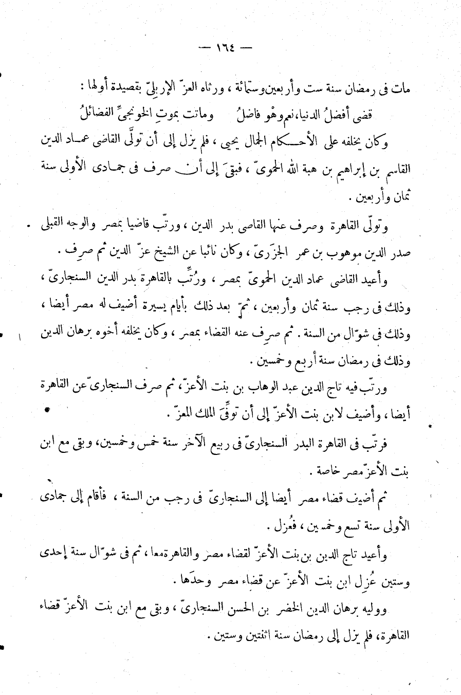 وأعيد القاضي عماد الدين الحموي بمصر، ورتب بالقاهرة بدر الدين السنجاري، وذلك في رجب سنة ثمان وأربعين، ثم بعد ذلك بأيام يسيرة أضيف له مصر أيضا، وذلك في شوال من السنة. ثم صرف عنه القضاء بمصر، وكان يخلفه أخوه برهان الدين، وذلك في رمضان سنة أربع وخمسين.