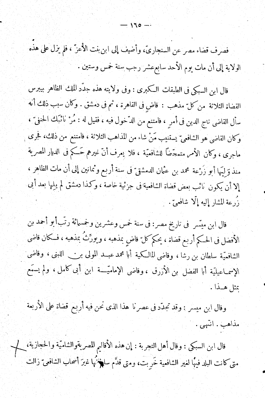 وقال ابن ميسر: وقد تجدد في عصرنا هذا الذي نحن فيه أربع قضاة على الأربعة مذاهب. انتهى.