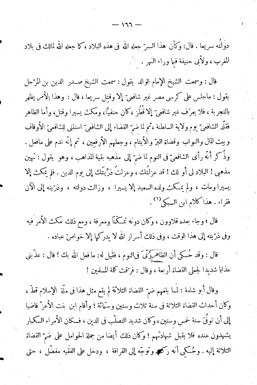 قال: وسمعت الشيخ الإمام الوالد يقول: سمعت الشيخ صدر الدين بن المرحل يقول: ما جلس على كرسي مصر غير شافعي إلا وقتل سريعا، قال: وهذا الأمر يظهر بالتجربة، فلا يعرف غير شافعي إلا قطز، كان حنفيا، ومكث يسيرا وقتل، وأما الظاهر فقلد الشافعي يوم ولاية السلطنة، ثم لما ضم القضاء إلى الشافعي استثنى للشافعي الأوقاف، وبيت المال والنواب وقضاة البر والأيتام، وجعلهم الأرفعين، ثم إنه ندم على ما فعل. وذكر أنه رأي الشافعي في النوم لما ضم إلى مذهبه بقية المذاهب، وهو يقول: تهين مذهبي! البلاد لي أو لك! قد عزلتك، وعزلت ذريتك إلى يوم الدين. فلم يمكث إلا يسيرا ومات، ولم يمكث ولده السعيد إلا يسيرًا، وزالت دولته، وذريته إلى الآن فقراء، هذا كلام ابن السبكي.