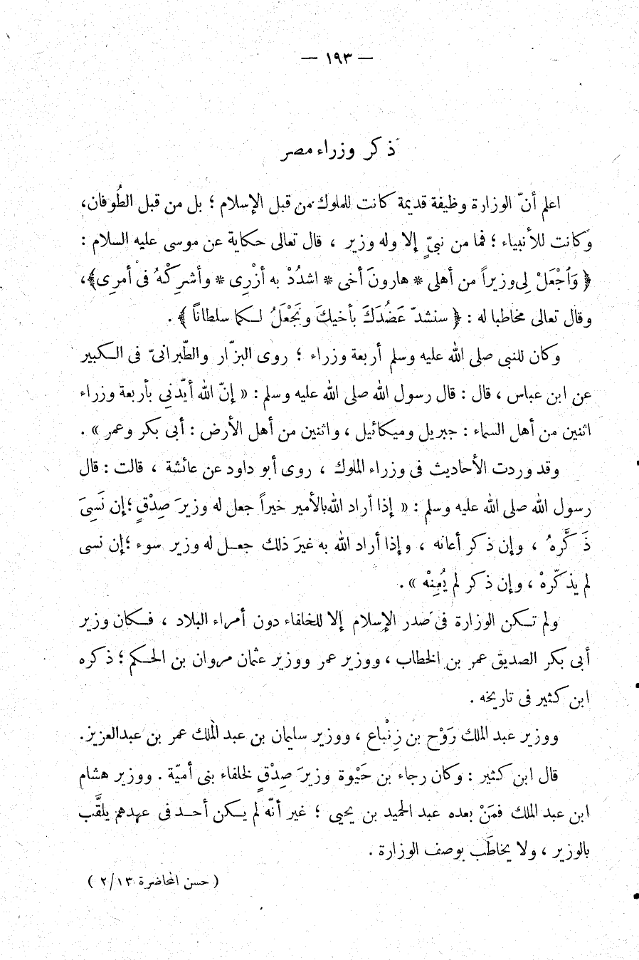 اعلم أن الوزارة وظيفة قديمة كانت للملوك من قبل الإسلام؛ بل من قبل الطوفان، وكانت للأنبياء؛ فما من نبي إلا وله وزير، قال تعالى حكاية عن موسى عليه السلام: {وَاجْعَلْ لِي وَزِيرًا مِنْ أَهْلِي، هَارُونَ أَخِي، اشْدُدْ بِهِ أَزْرِي، وَأَشْرِكْهُ فِي أَمْرِي} ، وقال تعالى مخاطبًا له: {سَنَشُدُّ عَضُدَكَ بِأَخِيكَ وَنَجْعَلُ لَكُمَا سُلْطَانًا} .