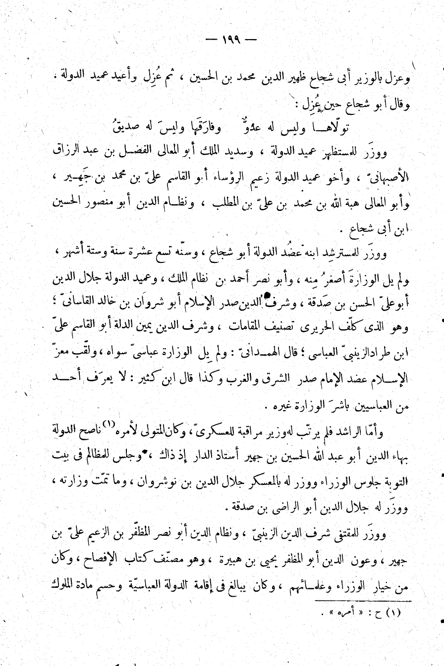 وأما الراشد فلم يرتب له وزير مراقبة للعسكري، وكان المتولي لأمره (¬1) ناصح الدولة بهاء الدين أبو عبد الله الحسين بن جهير أستاذ الدار إذ ذاك، وجلس للمظالم في بيت التوبة جلوس الوزراء، ووزر له بالمعسكر جلال الدين بن نوشروان، وما تمت وزارته، ووزر له جلال الدين أبو الراضي بن صدقة.