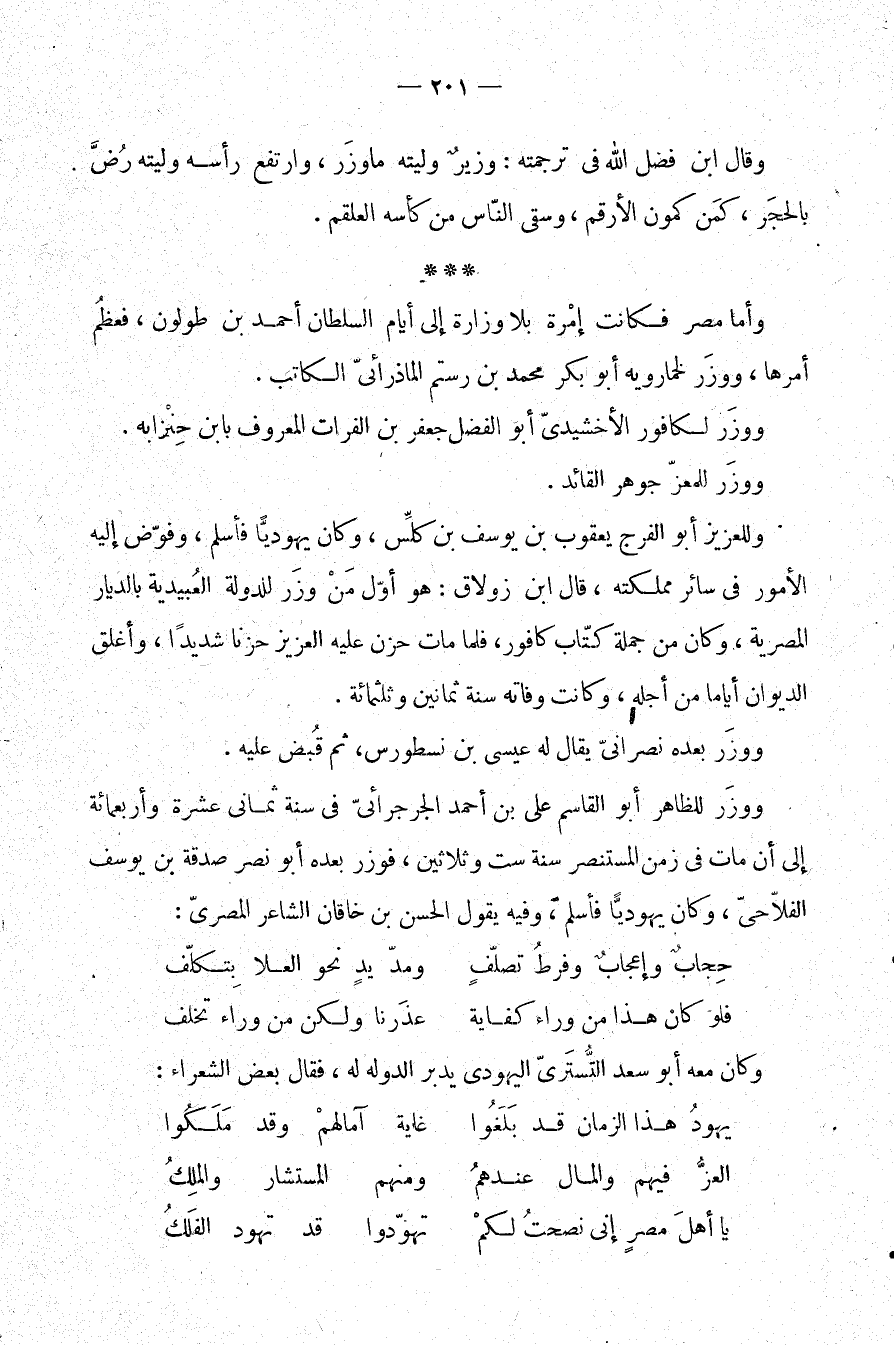 وقال ابن فضل الله في ترجمته: وزير وليته ما وزر، وارتفع رأسه وليته رض بالحجر، كمن كمون الأرقم، وسقى الناس من كأسه العلقم.