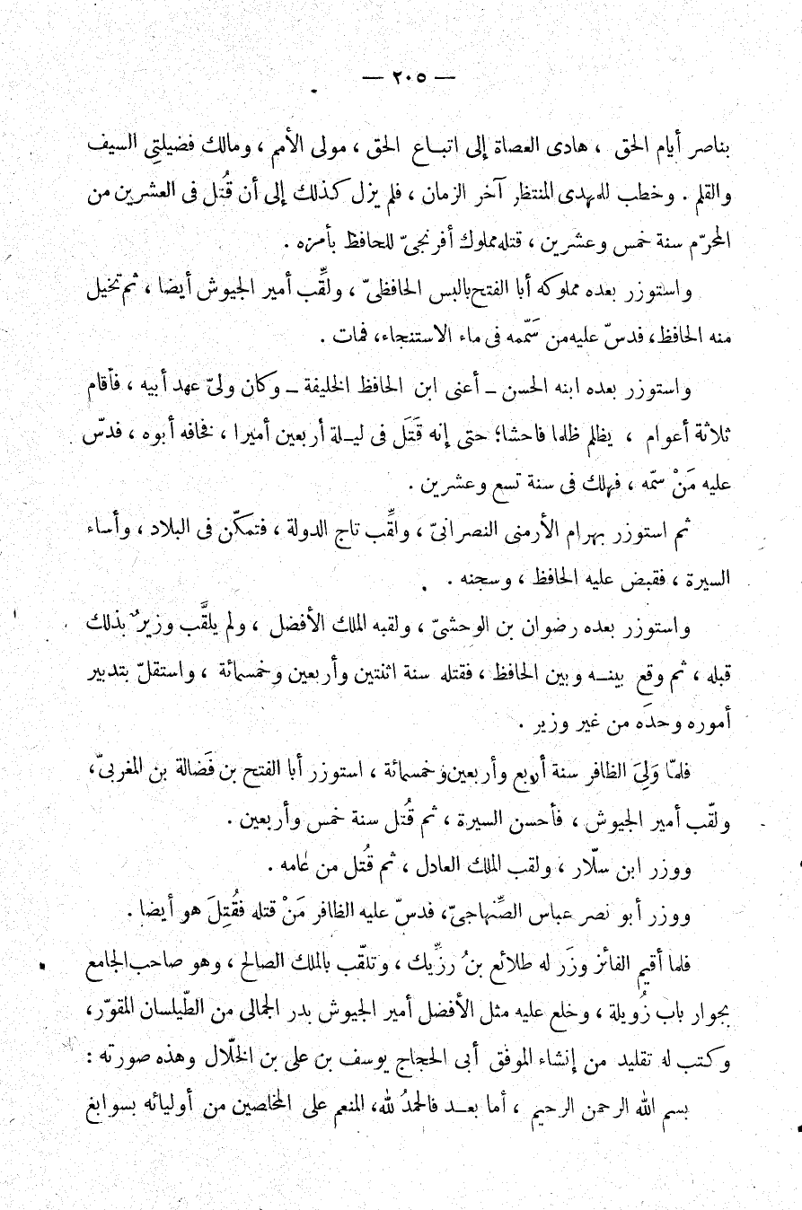 فلما أقيم الفائز وزر له طلائع بن زريك، وتلقب بالملك الصالح، وهو صاحب الجامع بجوار باب زويلة، وخلع عليه الأفضل أمير الجيوش بدر الجمالي من الطيلسان المقور، وكتب له تقليد من إنشاء الموفق أبي الحجاج يوسف بن علي بن الخلال، وهذه صورته: