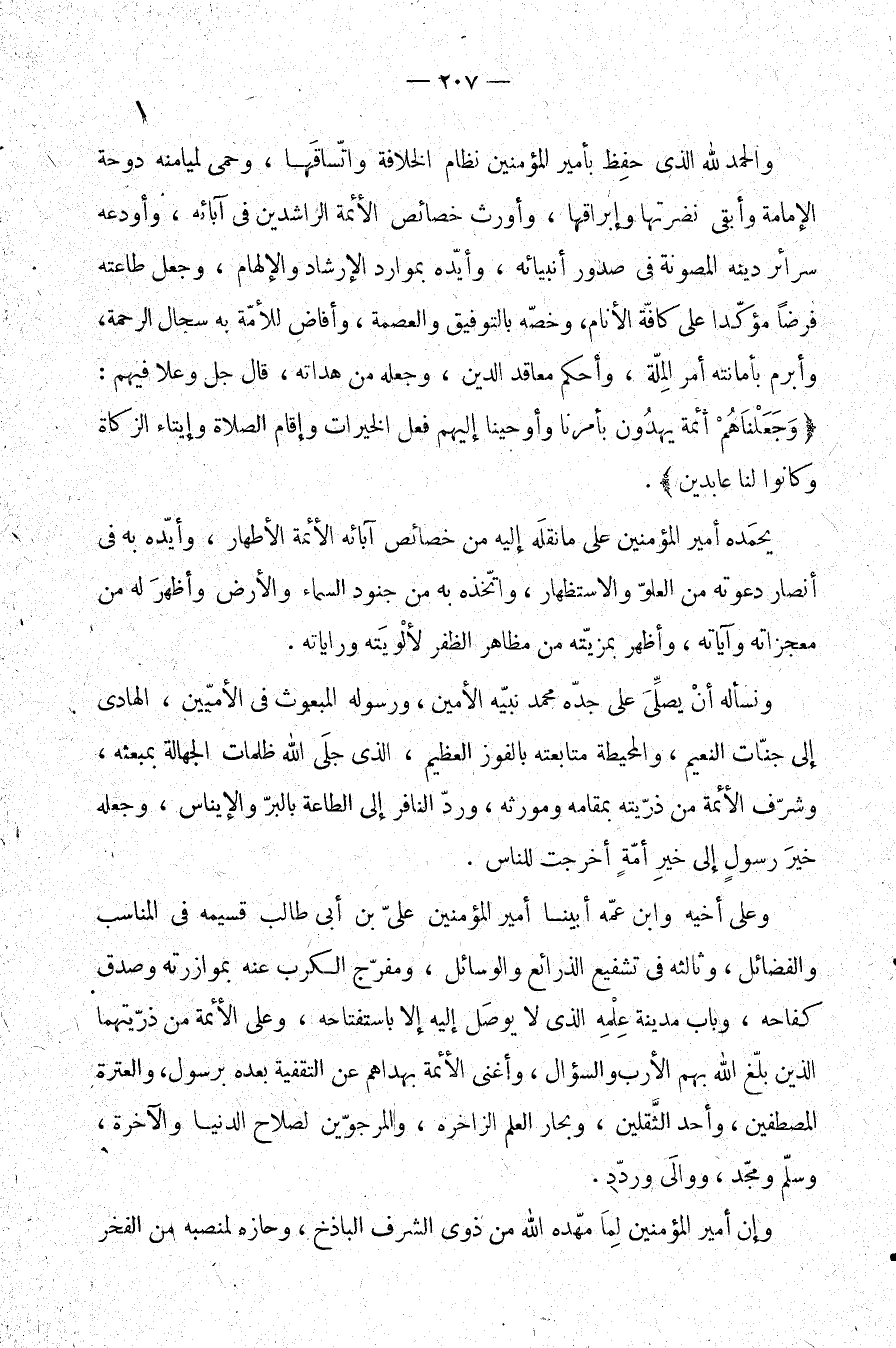 يحمده أمير المؤمنين على ما نقله إليه من خصائص آبائه الأئمة الأطهار، وأيده به في أنصار دعوته من العلو والاستظهار، واتخذه به من جنود السماء والأرض، وأظهر له من معجزاته وآياته، وأظهر بمزيته من مظاهر الظفر لألويته وراياته.