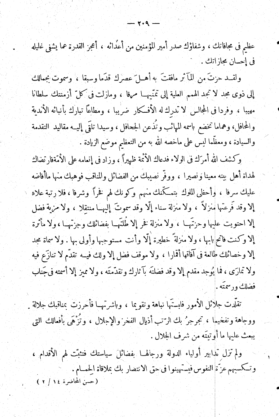 ولقد حزت من المآثر ما فقت به أهل عصرك قدمًا وسبقًا، وسموت بجمالك إلى ذرى مجد لا تجد الهمم العلية إلى تمنيها مرقا، وما زلت في كل أزمنتك سلطانا مهيبا، وفردا في المجالس لا تدرك له الأقمار ضريبا، ومطاعًا تبارك بأنبائه الأندية والمحافل، وهماما تخضع باسمه المهائب وتذعن الجحافل، وسيدا تلقى إليه مقاليد التقدمة والسيادة، ومعظما ليس على ما خصه الله به من التعظيم موضع الزيادة.