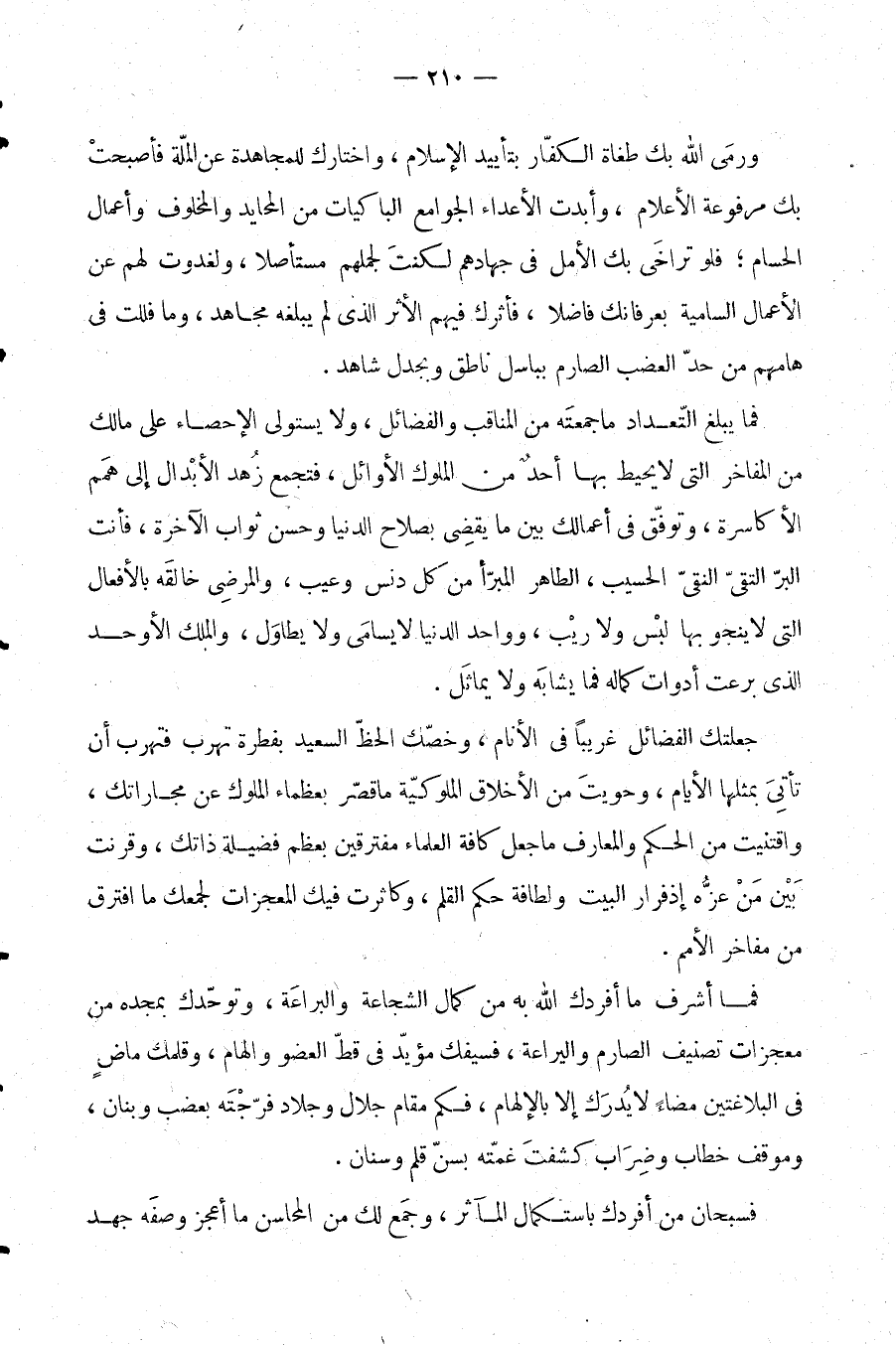 جعلتك الفضائل غريبًا في الأنام، وخصك الحظ السعيد بفطرة تهرب فتهرب أن تأتي بمثلها الأيام، وحويت من الأخلاق الملوكية ما قصر بعظماء الملوك عن مجاراتك، واقتنيت من الحكم والمعارف ما جعل كافة العلماء مفترقين بعظم فضيلة ذاتك، وقرنت بين من عزه إذفرار البيت ولطافة حكم القلم، وكاثرت فيك المعجزات لجمعك ما افترق من مفاخر الأمم.
