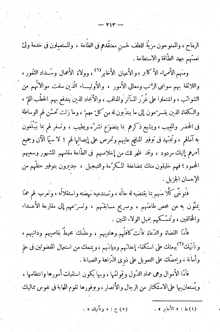 ومنهم الأمراء الأكابر، والأعيان الأخاير (¬1) ، وولاة الأعمال وسداد الثغور، واللائقة بهم سوامي الرتب ومعالي الأمور، والأولياء الذين سلمت موالاتهم من الشوائب، واشتملوا على غرر المآثر والمناقب، والأنجاد الذين يندفع بهم الخطب الملم، والكفاة الذين يتسرعون إلى ما يندبون له من كل مهم، وما زلت تحسن لهم الوساطة في المحضر والمغيب، ويشيع ذكرهم بما يتضوع نشره ويطيب، وتسفر لهم بما يبلغون به آمالهم، وتجهد في توفير المنافع عليهم، وتحرص على إيصالها لهم لا سيما الآن وجميع أمرهم إليك مردود، وقد ظهر لك إخلاصهم في الطاعة مقامهم المشهور وسعيهم المحمود؛ فهم خليقون منك بمضاعفة المكرمة والتبجيل، جديرون بتوفير حظهم من الإحسان الجزيل.