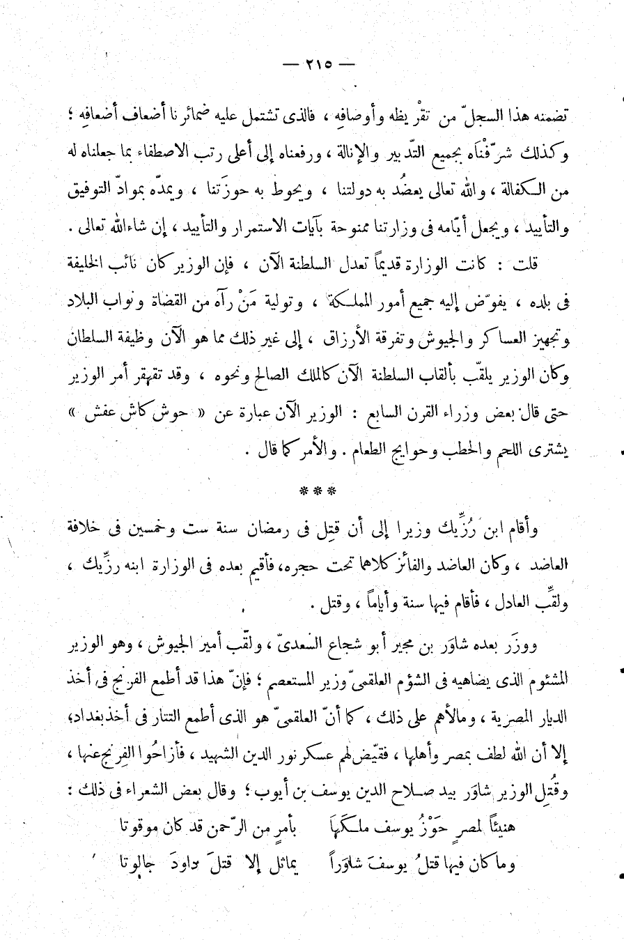 قلت: كانت الوزارة قديمًا تعدل السلطنة الآن، فإن الوزير كان نائب الخليفة في بلده، يفوض إليه جميع أمور المملكة، وتولية من رآه من القضاة ونواب البلاد وتجهيز العساكر والجيوش وتفرقة الأرزاق، إلى غير ذلك مما هو الآن وظيفة السلطان وكان الوزير يلقب بألقاب السلطنة الآن كالملك الصالح ونحوه، وقد تقهقر أمر الوزير حتى قال بعض وزراء القرن السابع: الوزير الآن عبارة عن "حوش كاش عفش" يشتري اللحم والحطب وحوايج الطعام، والأمر كما قال.