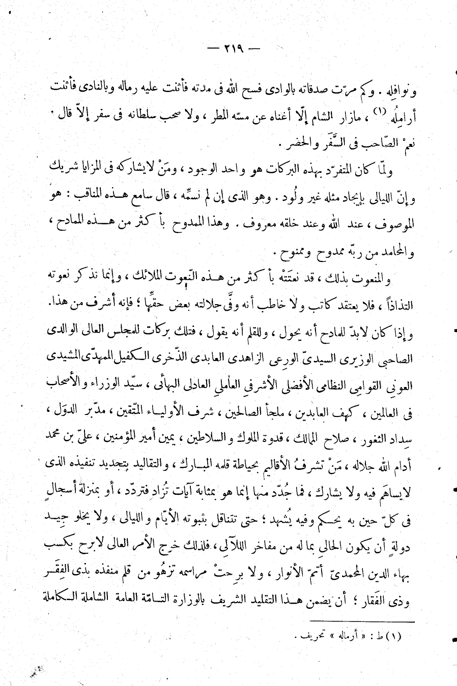 والمنعوت بذلك، قد نعتته بأكثر من هذه النعوت الملائك، وإنما نذكر نعوته التذاذًا، فلا يعتقد كاتب ولا خاطب أنه وفى جلالته بعض حقها؛ فإنه أشرف من هذا. وإذا كان لا بد للمادح أن يجول، وللقلم أن يقول، فتلك بركات للمجلس العالي الوالدي الصاحبي الوزيري السيدي الورعي الزاهدي العابدي الذخري الكفيل المهدي المشيدي العوني القوامي النظامي الأفضلي الأشرفي العاملي العادلي البهائي، سيد الوزراء والأصحاب في العالمين، كهف العابدين، ملجأ الصالحين، شرف الأولياء المتقين، مدبر الدول، سداد الثغور، صلاح الممالك، قدوة الملوك والسلاطين، يمين أمير المؤمنين، علي بن محمد أدام الله جلاله، من تشرف الأقاليم بحياطة قلمه المبارك، والتقاليد بتجديد تنفيذه الذي لا يساهم فيه ولا يشارك، فما جدد منها إنما هو بمثابة آيات تزاد فتردد، أو بمنزلة أسجال في كل حين به يحكم وفيه يشهد؛ حتى تتناقل بثبوته الأيام والليالي، ولا يخلو جيد دولة أن يكون الحالي بما له من مفاخر اللآلئ، فلذلك خرج الأمر العالي لا برح بكسب بهاء الدين المحمدي أتم الأنوار، ولا برحت مراسمه تزهو من قلم منفذه بذي الفقر وذي الفقار؛ أن يضمن هذا التقليد الشريف بالوزارة التامة العامة الشاملة الكاملة
