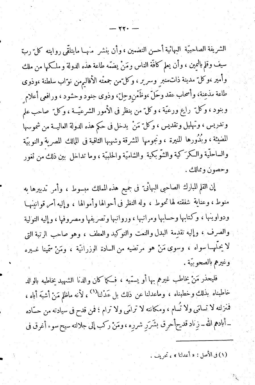 إن القلم المبارك الصاحبي البهائي في جميع هذه الممالك مبسوط، وأمر تدبيرها به منوط، وعناية شفقته لها تحوط، وله النظر في أحوالها وأموالها، وإليه أمر قوانينها ودواوينها، وكتابها وحسابها ومراتبها، ورواتبها وتصريفها ومصروفها، وإليه التولية والصرف، وإليه تقدمة البدل والنعت والتوكيد والعطف، وهو صاحب الرتبة التي لا يحلها سواه، وسوى من هو مرتضيه من السادة الوزرانية، ومن سمينا غيره وغيرهم بالصحوبية.