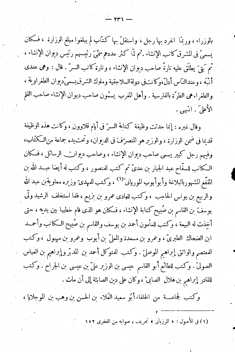 وقال غيره: إنما حدثت وظيفة كتابة السر في أيام قلاوون، وكانت هذه الوظيفة قديما في ضمن الوزارة، والوزير هو المتصرف في الديوان، وتحت يده جماعة من الكتاب، وفيهم رجل كبير يسمى صاحب ديوان الإنشاء، وصاحب ديوان الرسائل، فكان الكاتب للسفاح عبد الجبار بن عدي ثم كتب للمنصور، وكتب أيضا عبد الله بن المقفع المشهور بالبلاغة وأبو أيوب المورياني (¬1) ، وكتب للمهدي وزيره معاوية بن عبد الله والربيع بن يونس الحاجب، وكتب للهادي عمرو بن بزيع، فلما استخلف الرشيد ولي يوسف بن القاسم بن صبيح كتابة الإنشاء، فكان هو الذي قام خطيبا بين يديه، حتى أخذت له البيعة، وكتب للمأمون أحمد بن يوسف بن صبيح الكاتب وأحمد ابن الضحاك الطبري، وعمرو بن مسعدة، والمعلى بن أيوب وعمرو بن مهبول، وكتب للمعتصم والواثق إبراهيم الموصلي. وكتب للمتوكل أحمد بن المدبر وإبراهيم بن العباس الصولي. وكتب للطائع أبو القاسم عيسى بن الوزير علي بن عيسى بن الجراح. وكتب للقادر إبراهيم بن هلال الصابئ، وكان على دين الصابئة إلى أن مات.