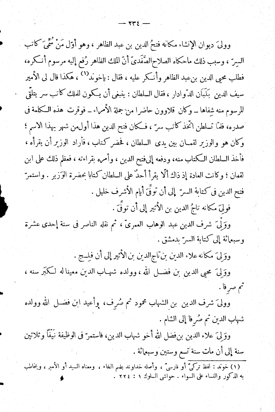 وولي ديوان الإنشاء مكانه فتح الدين بن عبد الظاهر، وهو أول من سمي كاتب السر، وسبب ذلك ما حكاه الصلاح الصفدي أن الملك الظاهر رفع إليه مرسوم أنكره، فطلب محيي الدين بن عبد الظاهر وأنكر عليه، فقال: يا خوند (¬1) ، هكذا قال لي الأمير سيف الدين بن بلبان الدوادار، فقال السلطان: ينبغي أن يكون للملك كاتب سر يتلقى المرسوم منه شفاها -وكان قلاوون حاضرا من جملة الأمراء- فوقرت هذه الكلمة في صدره، فلما تسلطن اتخذ كاتب سر، فكان فتح الدين هذا أول من شهر بهذا الاسم؛ وكان هو والوزير لقمان بين يدي السلطان، فحضر كتاب، فأراد الوزير أن يقرأه، فأخذ السلطان الكتاب منه، ودفعه إلى فتح الدين، وأمره بقراءته، فعظم ذلك على ابن لقمان؛ وكانت العادة إذ ذاك ألا يقرأ أحد على السلطان كتابا بحضرة الوزير. واستمر فتح الدين في كتابة السر إلى أن توفي أيام الأشرف خليل.