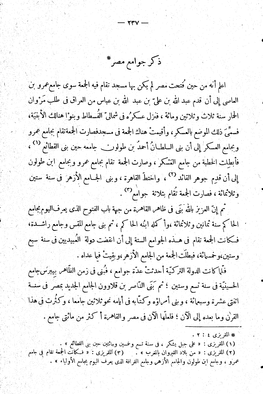 (¬3) المقريزي: "فكانت الجمعة تقام في جامع عمرو، وجامع ابن طولون والجامع الأزهر، وجامع القرافة الذي يعرف اليوم بجامع الأولياء".