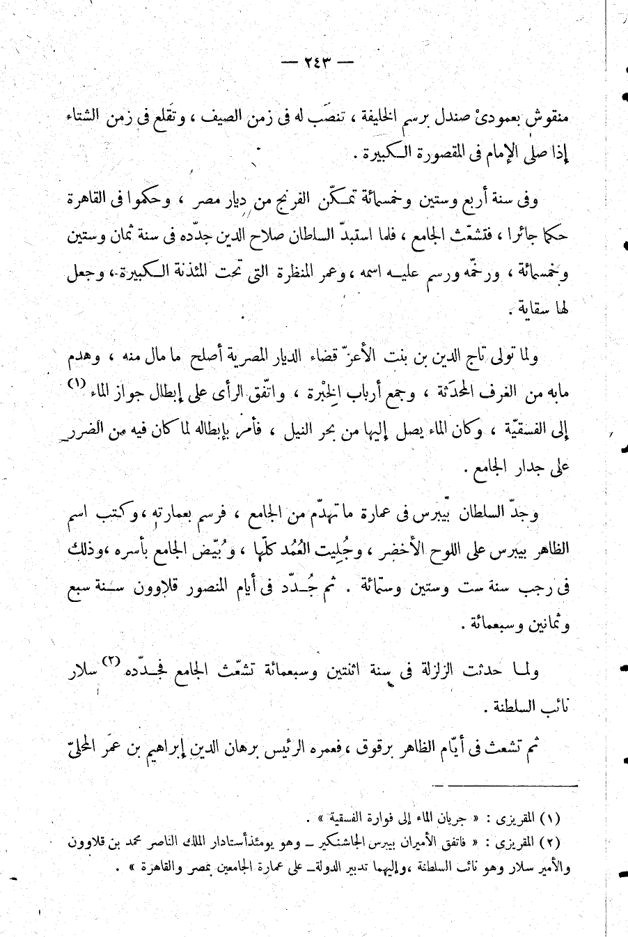 (¬2) المقريزي: "فأنفق الأميران بيبرس الجاشنكير -وهو يومئذ أستادار الملك الناصر محمد بن قلاوون، والأمير سلار وهو نائب السلطنة، وإليهما تدبير الدولة- على عمارة الجامعين بمصر والقاهرة".