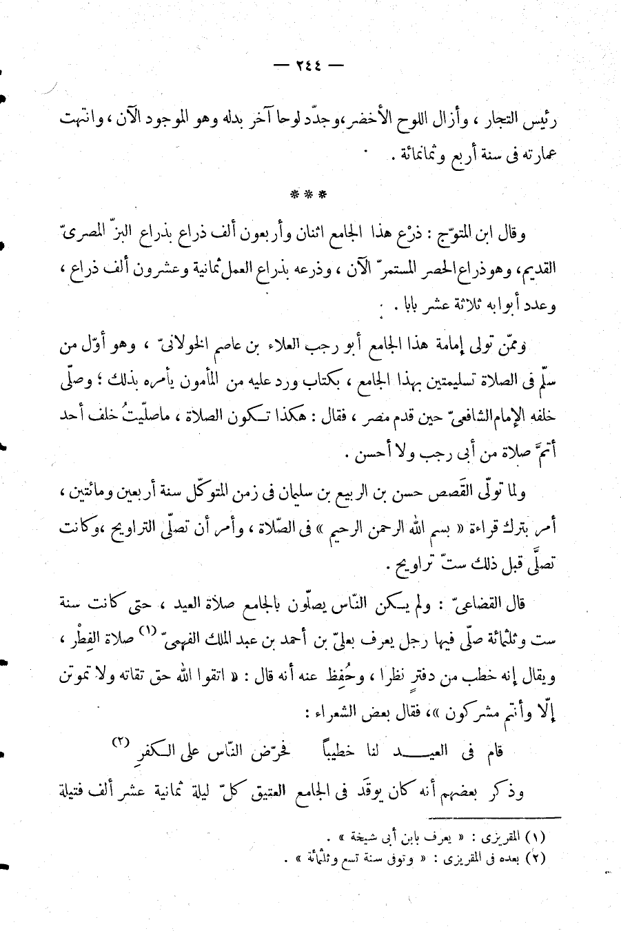 ولما تولى القصص حسن بن الربيع بن سليمان في زمن المتوكل سنة أربعين ومائتين، أمر بترك قراءة "بسم الله الرحمن الرحيم" في الصلاة، وأمر أن تصلى التراويح، وكانت تصلى قبل ذلك ست تراويح.