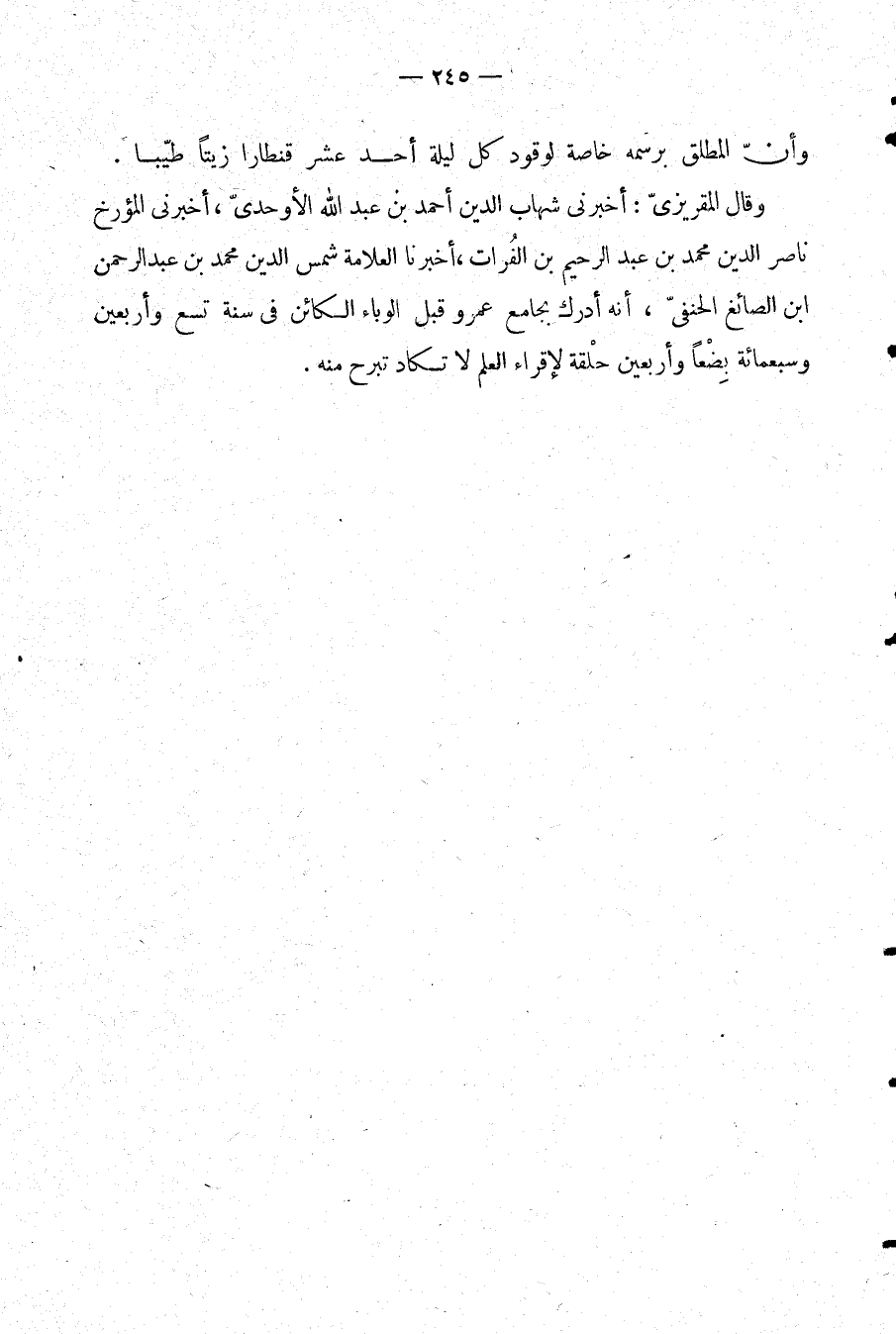 وقال المقريزي: أخبرني شهاب الدين أحمد بن عبد الله الأوحدي، أخبرني المؤرخ ناصر الدين محمد بن عبد الرحيم بن الفرات، أخبرنا العلامة شمس الدين محمد بن عبد الرحمن بن الصائغ الحنفي، أنه أدرك بجامع عمرو قبل الوباء الكائن في سنة تسع وأربعين وسبعمائة بضعًا وأربعين حلقة لإقراء العلم لا تكاد تبرح منه.