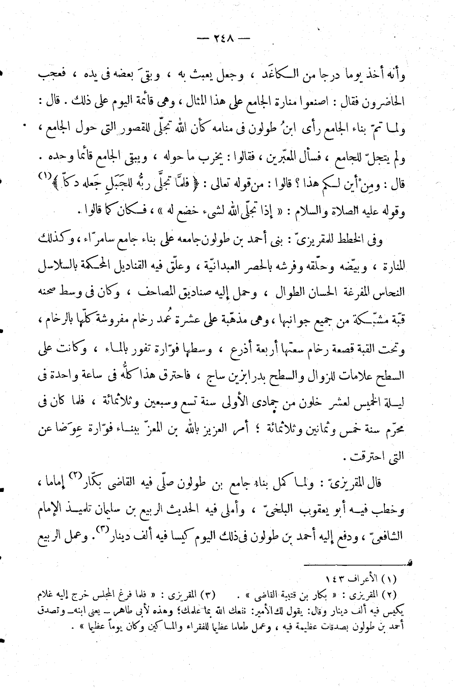 وأنه أخذ يومًا درجًا من الكاغد، وجعل يعبث به، وبقي بعضه في يده، فعجب الحاضرون فقال: اصنعوا منارة الجامع على هذا المثال، وهي قائمة اليوم على ذلك. قال: ولما تم بناء الجامع رأى ابن طولون في منامه كأن الله تجلى للقصور التي حول الجامع، ولم يتجل للجامع، فسأل المعبرين، فقالوا: يخرب ما حوله، ويبقى الجامع قائما وحده. قال: ومن أين لكم هذا؟ قالوا: من قوله تعالى: {فَلَمَّا تَجَلَّى رَبُّهُ لِلْجَبَلِ جَعَلَهُ دَكًّا} (¬1) . وقوله عليه الصلاة والسلام: "إذا تجلى الله لشيء خضع له"، فكان كما قالوا.