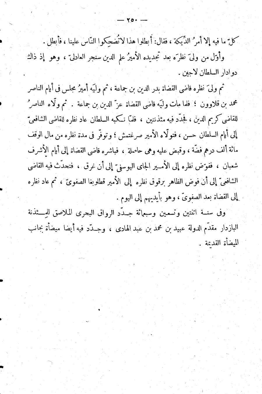 ثم ولي نظره قاضي القضاة بدر الدين بن جماعة، ثم وليه أمير مجلس في أيام الناصر محمد بن قلاوون؛ فلما مات وليه قاضي القضاة عز الدين بن جماعة. ثم ولاه الناصر للقاضي كريم الدين، فجدد فيه مئذنتين، فلما نكبه السلطان عاد نظره للقاضي الشافعي إلى أيام السلطان حسن، فتولاه الأمير صرغتمس؛ وتوفر في مدة نظره من مال الوقف مائة ألف درهم فضة، وقبض عليه وهي حاصلة، فباشره قاضي القضاة إلى أيام الأشرف شعبان، ففوض نظره إلى الأمير الجاي اليوسفي إلى أن غرق، فتحدث فيه القاضي الشافعي إلى أن فوض الظاهر برقوق نظره إلى الأمير قطلوبغا الصفوي، ثم عاد نظره إلى القضاة بعد الصفوي، وهو بأيديهم إلى اليوم.
